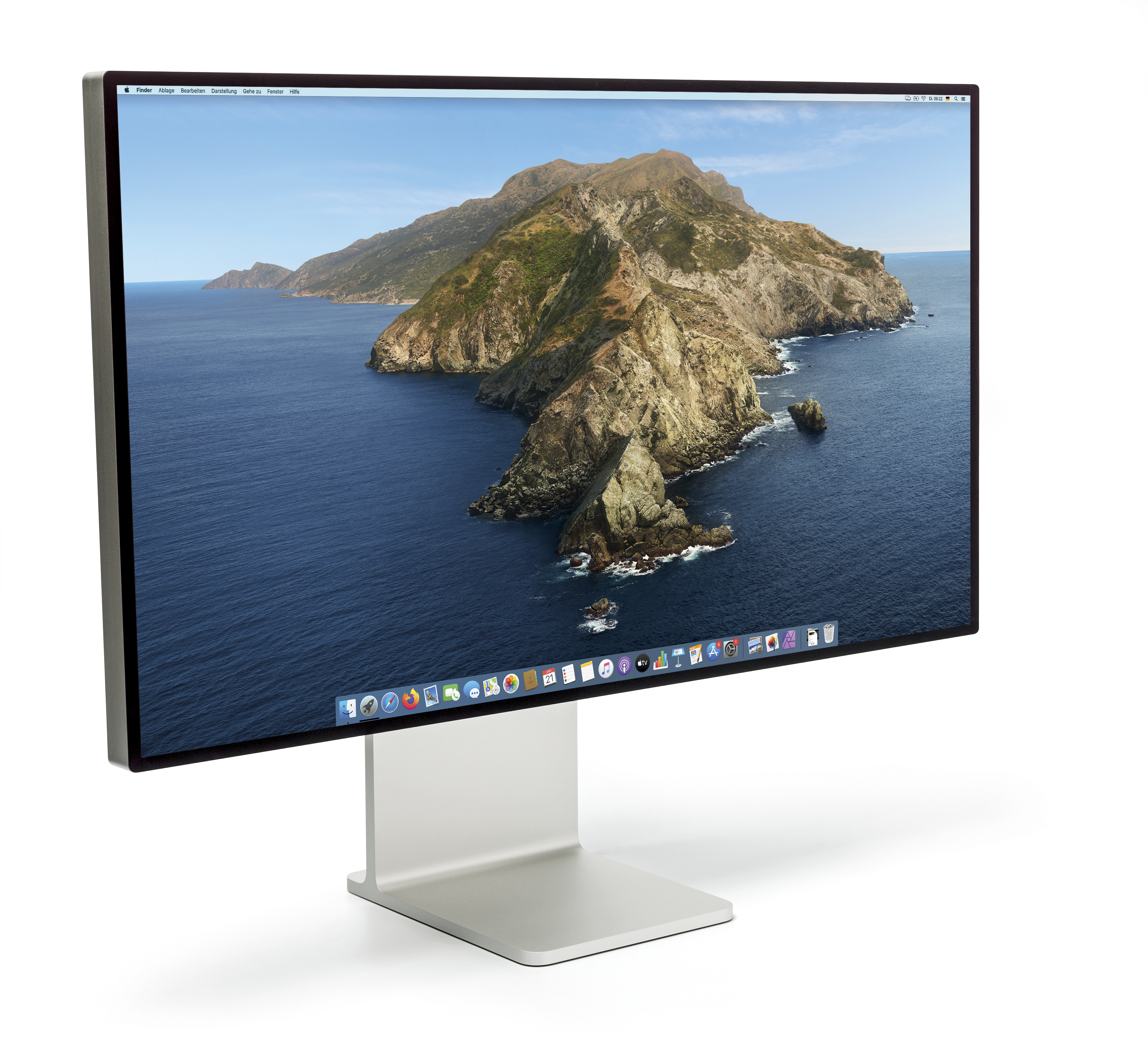 Mit 6K-Auflösung (6016 × 3384 Pixel, wie üblich mit „Retina“-Bildschärfe von 218 dpi) im 16:9-Format auf 32 Zoll, 10 Bit Farbtiefe, DCI-P3-Farbraum und einem 576-Zonen-Backlight mit einer Spitzenhelligkeit von 1600 cd/m2 zielt Apple auf Profis. Die feine Technik hat allerdings ihren Preis: Schon die Basisversion des Pro Display XDR, die uns Apple für den Test zur Verfügung stellte, kostet 5500 Euro, die mattierte Variante mit Nanotexturglas 1000 Euro mehr. Bei ihr ätzt Apple nach eigenen Angaben feinste unregelmäßige Strukturen in die Frontscheibe, um das einfallende Umgebungslicht zu streuen und so Reflexionen zu verhindern. Für den Schreibtisch fehlt dann noch der Ständer. Entscheidet man sich für den Pro Stand, an dem das Display magnetisch andockt, werden weitere 1100 Euro fällig. Der VESA-Mount-Adapter kostet 220 Euro.