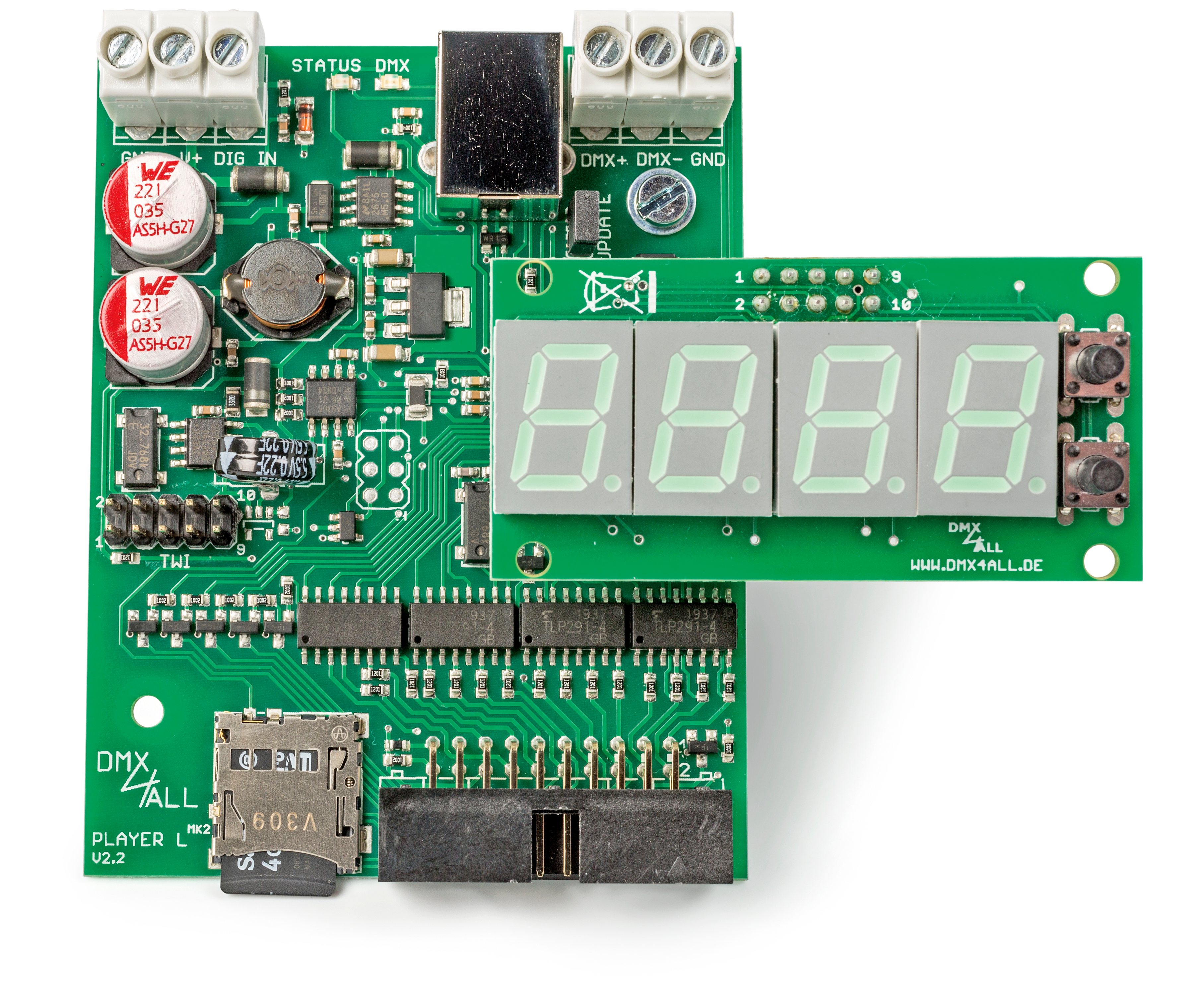 Die kaum zigarettenschachtelgroße Platine beherbergt Prozessor, Speicher, Slot für eine MicroSD-Karte und die Schnittstellen für Bedienelemente und DMX-Equipment. Ein optionales vierstelliges Display wird über einen TWI/I2C-Bus angekoppelt; es zeigt die aktuell laufende Szene an. Lediglich Netzteil und Taster muss man ergänzen, was dank steck- und schraubbarer Anschlüsse weitgehend problemlos gelingt.