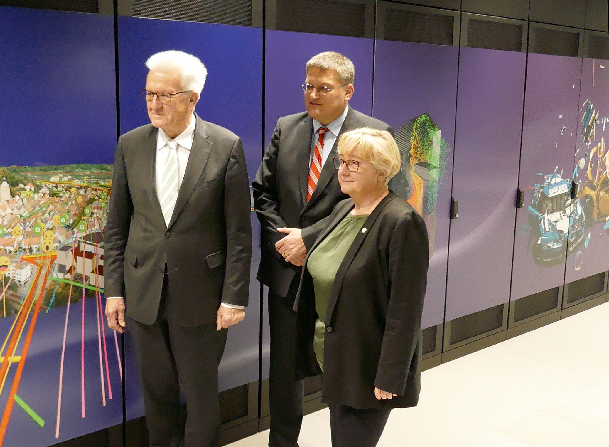 Am Stuttgarter Hochleistungsrechenzentrum HLRS nahm der baden-württembergische Ministerpräsident Winfried Kretschmann den 26-Petaflops-Supercomputer Hawk mit 11.264 AMD-Epyc-Prozessoren aber noch persönlich in Betrieb. Die theoretische Rechenleistung des Hawk liegt nahe bei der des Garchinger SuperMUC-NG, der Falke (Hawk) hat aber deutlich mehr CPU-Kerne. Daher dürften viele Anwendungen schneller laufen. Wer das Foto der Hawk-Schränke genau betrachtet, erkennt darauf das mit der Simulationssoftware LS-Dyna berechnete Bild des „Lego Porsche Crash“ – der wiederum auf eine Idee der c’t-Volontäre aus dem Jahr 2017 zurückgeht. Die Simulation wurde freilich noch auf dem Hawk-Vorgänger Hazel Hen berechnet, der nun abgebaut wird: Das Energiebudget am HLRS reicht nicht zum Betrieb beider Superrechner gleichzeitig.
