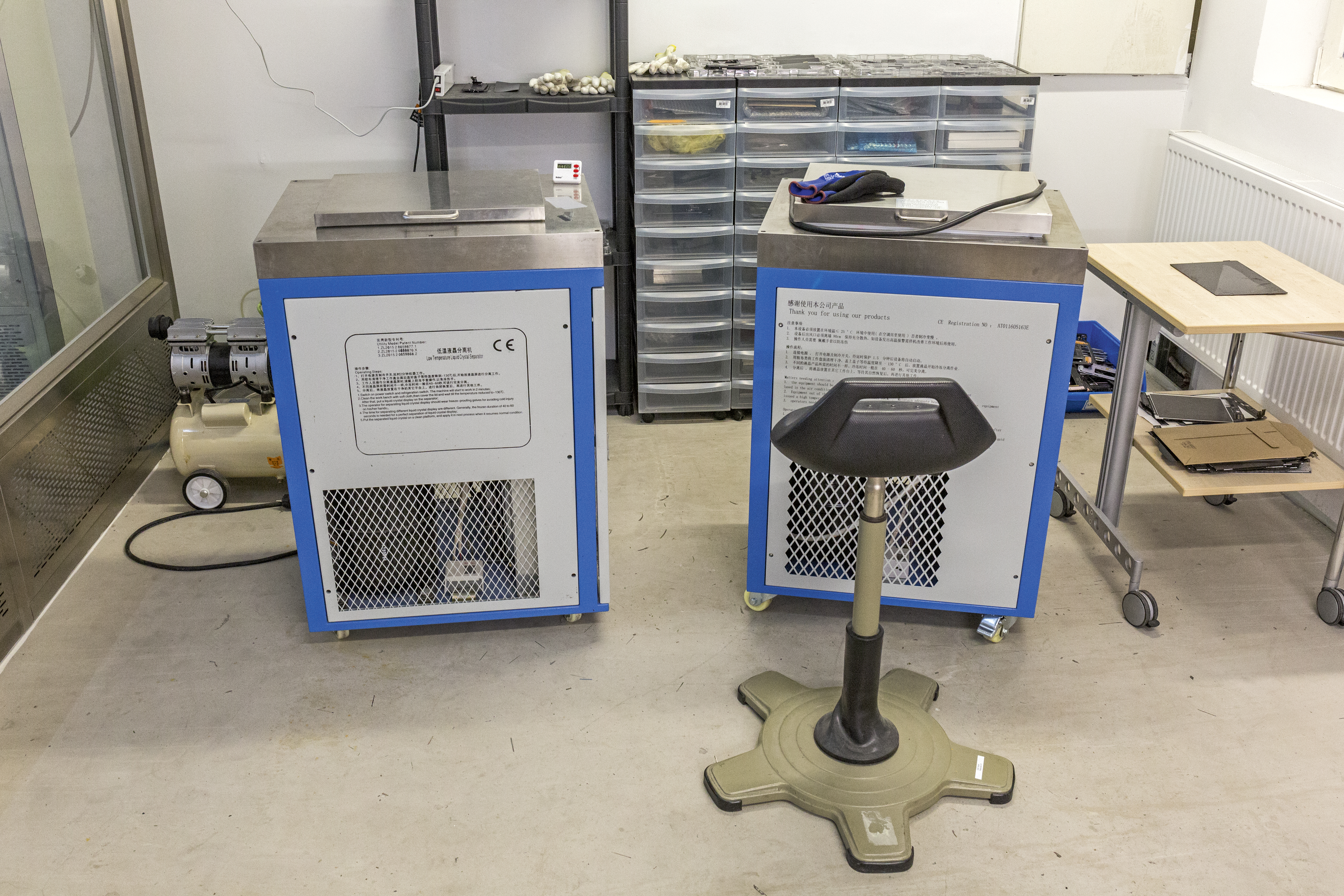 Stattdessen ist Spezialequipment nötig. Häufig werden die Displays auf speziellen Vakuumheizplatten erwärmt, um den Kleber zwischen Glas und Bildschirm zu lösen und dann das Glas mit einem hauchdünnen Draht abzutrennen. Doch diese Methode funktioniert längst nicht bei allen Modellen. Die gebogenen Edge-Displays von Samsung werden in eine Art Gefriertruhe („Freezer“) gesteckt, die sie auf rund minus 150 Grad Celsius herunterkühlt. Bei dieser Temperatur bröckelt der Kleber, die wichtigen Teile werden aber nicht beschädigt. In El-Chafeis Werkstatt stehen zwei dieser Truhen.