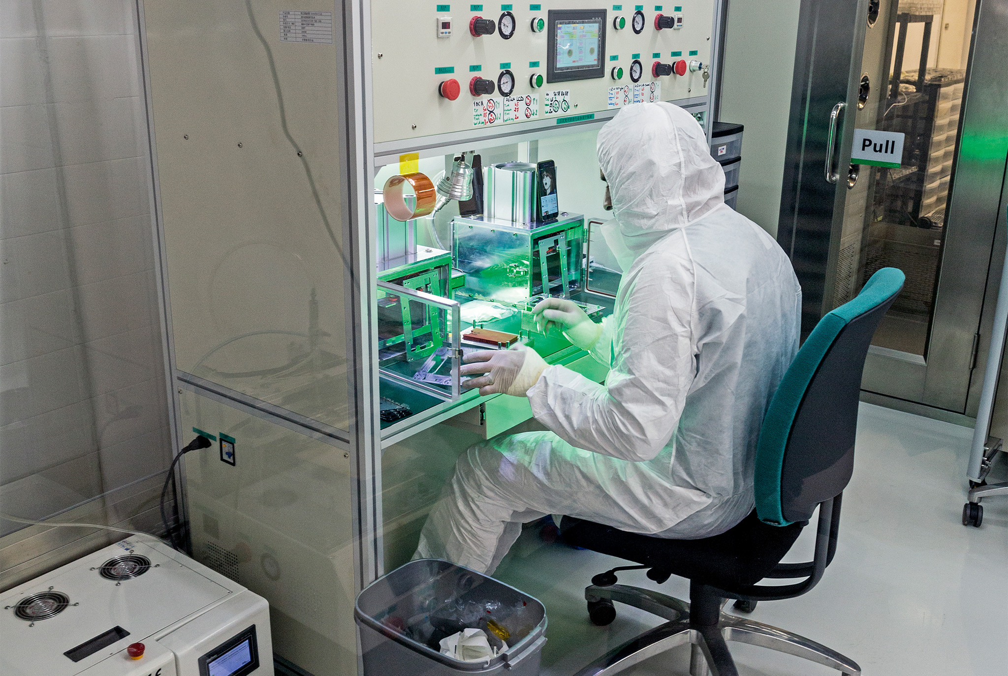 Die neuen Glasscheiben werden mit speziellen Laminiergeräten aufgeklebt. In El-Chafeis Reinraum steht ein besonders großes Exemplar. „Die industrielle Ausführung“, erklärt er. „Wenn man Mengen durchjagen will, braucht man die richtige Maschine.“ Ein kleineres Gerät steht ungenutzt auf dem Boden – es war El-Chafei zu unzuverlässig.