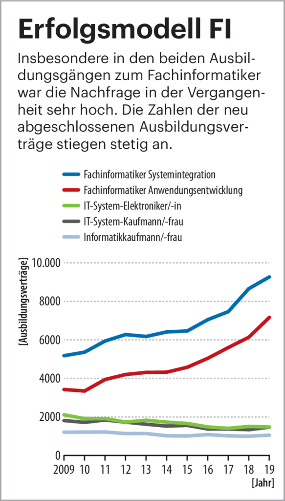 Berufsausbildungen mit den Abschlüssen Fachinformatiker/-in (FI), IT-System-Elektroniker/-in, IT-System-Kaufmann/-frau oder Informatikkaufmann/-frau sind sehr gefragt. Diese vier dualen – also parallel im Betrieb und in der Berufsschule vermittelten – IT-Berufe stießen gleich nach ihrer Einführung im Jahr 1997 auf großes Interesse. Schon im ersten Jahr nahmen fast 5000 Jugendliche eine Ausbildung in den damals neuen Berufen auf. Insgesamt haben bis heute etwa 300.000 Jugendliche ihren Abschluss in einem dieser vier Berufe gemacht. Der besonders gefragte FI konnte sich mit 16.437 neuen Verträgen im Jahr 2019 auf Platz 7 in der Rangliste der beliebtesten Ausbildungen behaupten.