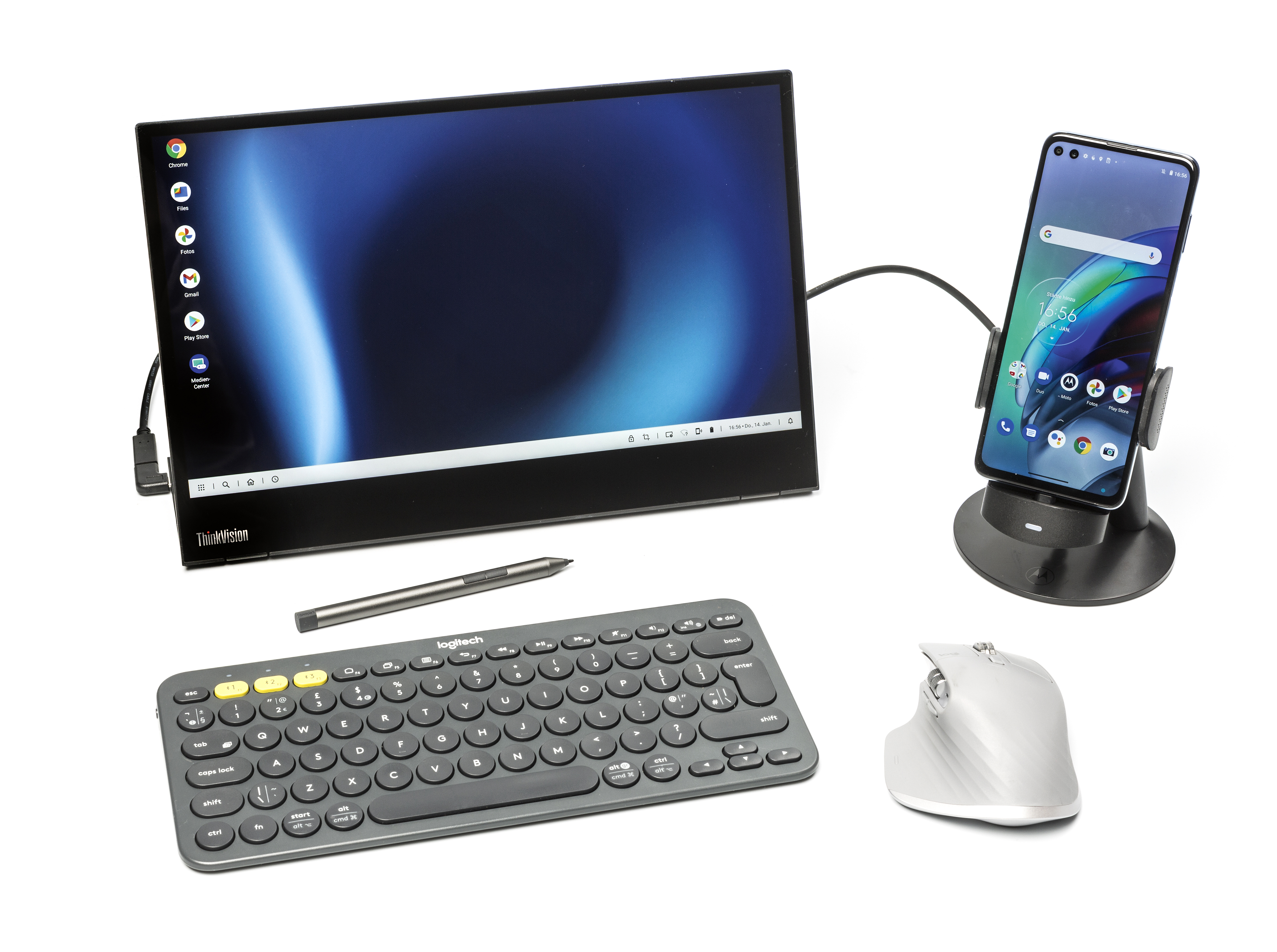 Motorola ist nicht der erste Hersteller, der seine Smartphones mit einem Desktopmodus ausstattet. Vergleichbar ausgerüstet sind einige Oberklasse-Smartphones von Huawei, LG und Samsung. Allerdings kommt nur das Moto G100 direkt mit dem passenden Zubehör aus USB-C-Dock und USB-C-auf-HDMI-Kabel. Fürs produktive Arbeiten lassen sich per Bluetooth oder über ein USB-C-Dock per Kabel Maus und Tastatur verbinden. Das beiliegende Dock reicht über einen USB-C lediglich das Bildsignal weiter, weitere Ports sucht man vergeblich. Schließt man nur eine Tastatur an, kann man den Smartphone-Screen als Touchpad verwenden.