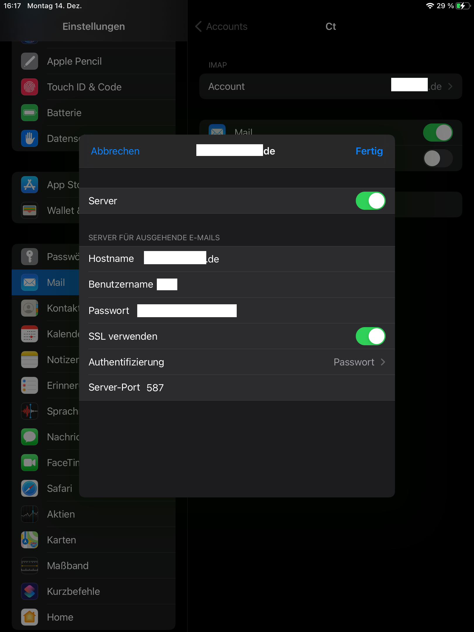 Wenn Sie diese unintuitive Fehlermeldung sehen, fehlen vermutlich der Benutzername und das dazugehörige Passwort für den Postausgangsserver in den Mail-Einstellungen. Um diese Informationen hinzuzufügen, gehen Sie in die Einstellungen Ihres iPads oder iPhones auf „Mail“ und Ihren Account und geben bei „Server für ausgehende E-Mails“ unter „Primärer Server“ den Benutzernamen und das Passwort für den Postausgangsserver ein. (kim@ct.de)