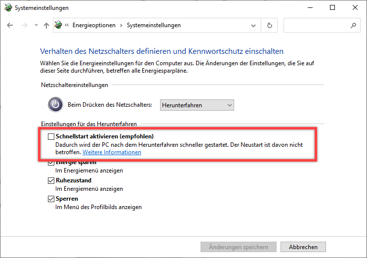Als „Schnellstart“ bezeichnet Windows Folgendes: Es beendet beim Herunterfahren zwar alle Anwendungen, legt sich selbst aber nur schlafen. So braucht es beim nächsten Einschalten des PCs nur aufzuwachen und startet somit spürbar schneller. Der Schnellstart ist also eine Variante des Ruhezustands (Hibernate). Und wie beim echten Ruhezustand, bei dem auch die Anwendungen schlafen, sollte der PC beim Aufwachen in genau demselben Zustand sein wie beim Einschlafen. Denn sonst droht Datenverlust, weil das aufwachende Betriebssystem damit rechnet, dass sich an den eingebundenen Dateisystemen nichts geändert hat. Genau das kann aber passieren, wenn Sie zwischenzeitlich ein parallel installiertes Betriebssystem starten, daher unsere Empfehlung zum Deaktivieren des Schnellstarts.