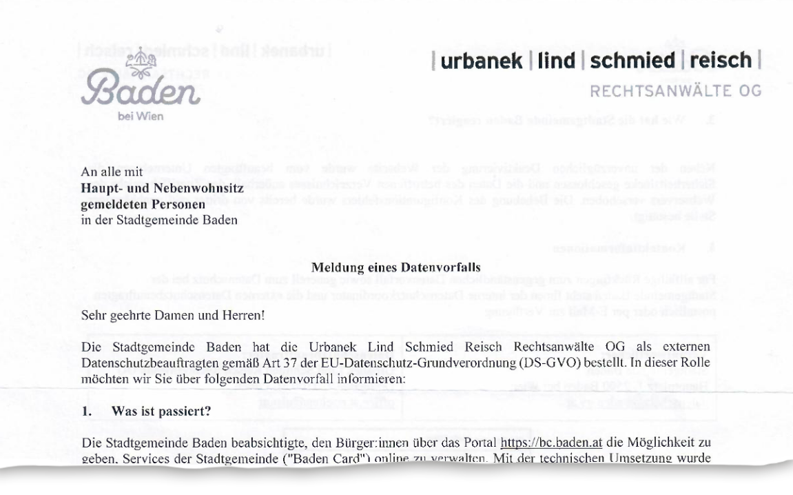 Nach unserem Bericht über ein Datenleck in der Stadt Baden in Österreich meldete uns ein Leser, dass er am 14. April ein Infoschreiben über den Datenvorfall erhalten hat. In dem Schreiben, das uns vorliegt, bestätigt die Stadt, dass die Meldedaten von 33.400 Wohnsitzdatensätzen, 14.400 Datensätze der Baden Card sowie Zahlungsvorgänge von etwa 750 Personen von einem „Datenvorfall“ betroffen waren.
