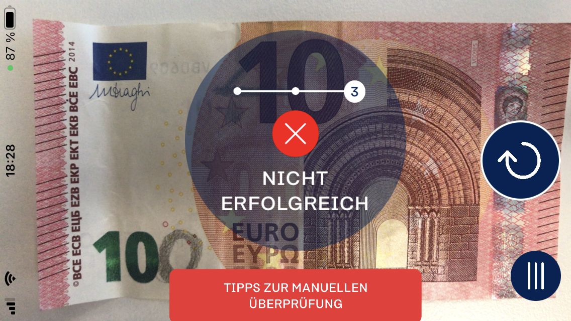 Für die Prüfung legt der Anwender den Geldschein glatt auf einen Tisch – unter eine Glasscheibe geht auch – und fotografiert ihn. Dabei leitet die App ihre Nutzer an, gegebenenfalls die Vorderseite nach oben zu drehen, die Banknote zu zentrieren und am eingeblendeten Rahmen auszurichten. Das Blitzlicht schaltet sich automatisch zu. Per Mustererkennung kontrolliert die App das Druckbild des vorliegenden Geldscheins.