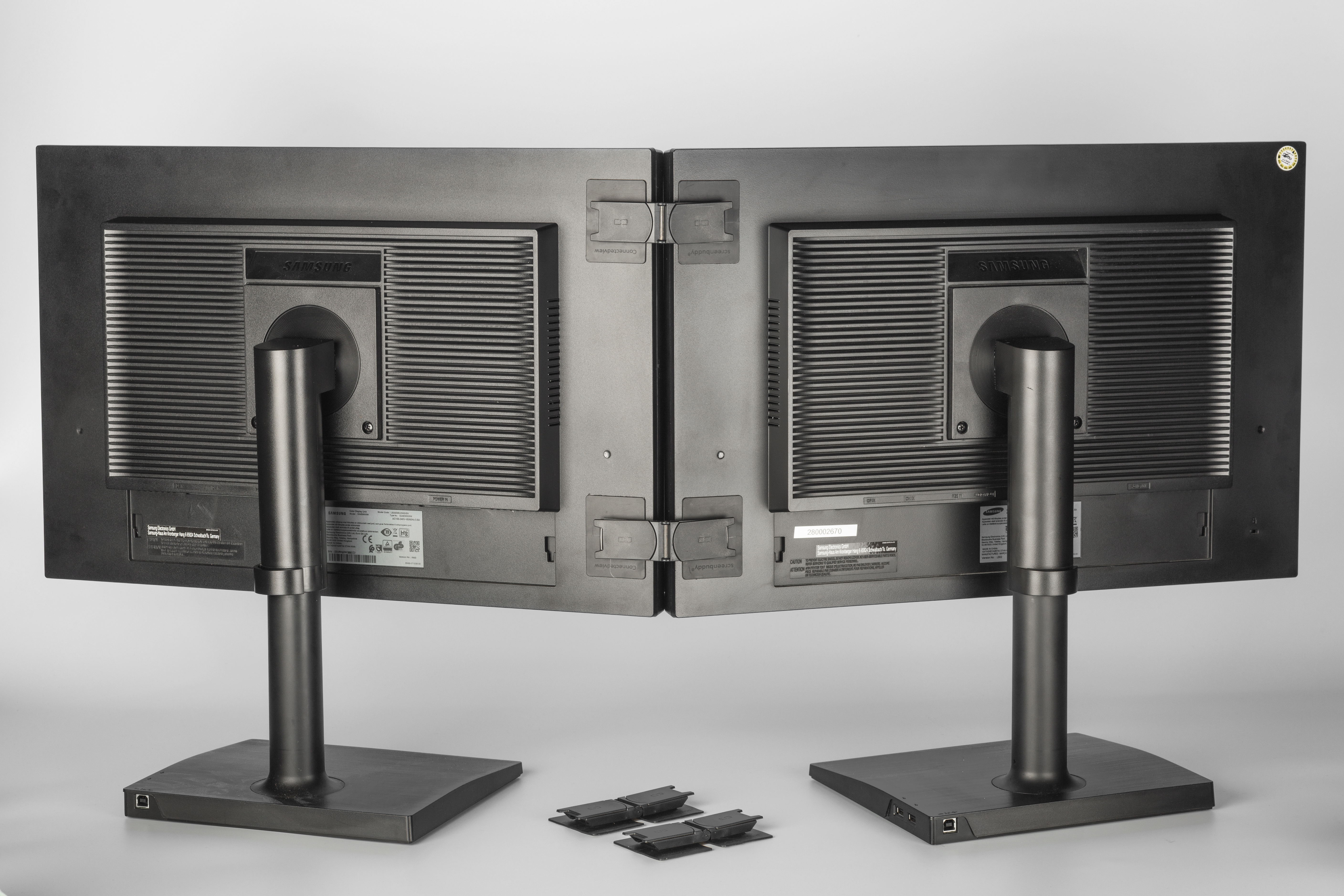 Der Screenbuddy fixiert zwei Bildschirme nahtlos nebeneinander. Müssen sie vorübergehend anders platziert werden, bringt man die Monitore per Magnetverschluss schnell wieder in die originale Lage. Das Set für zwei Monitore, bestehend aus vier kleinen Platten, haftet mit silikonisiertem PE-Klebeband sicher an Kunststoffen und lackierten Oberflächen. Wir konnten die Platten sogar einige Male vorsichtig ablösen und wieder anbringen; allzu oft sollte man das aber nicht tun, sonst kleben die Pads nicht mehr.