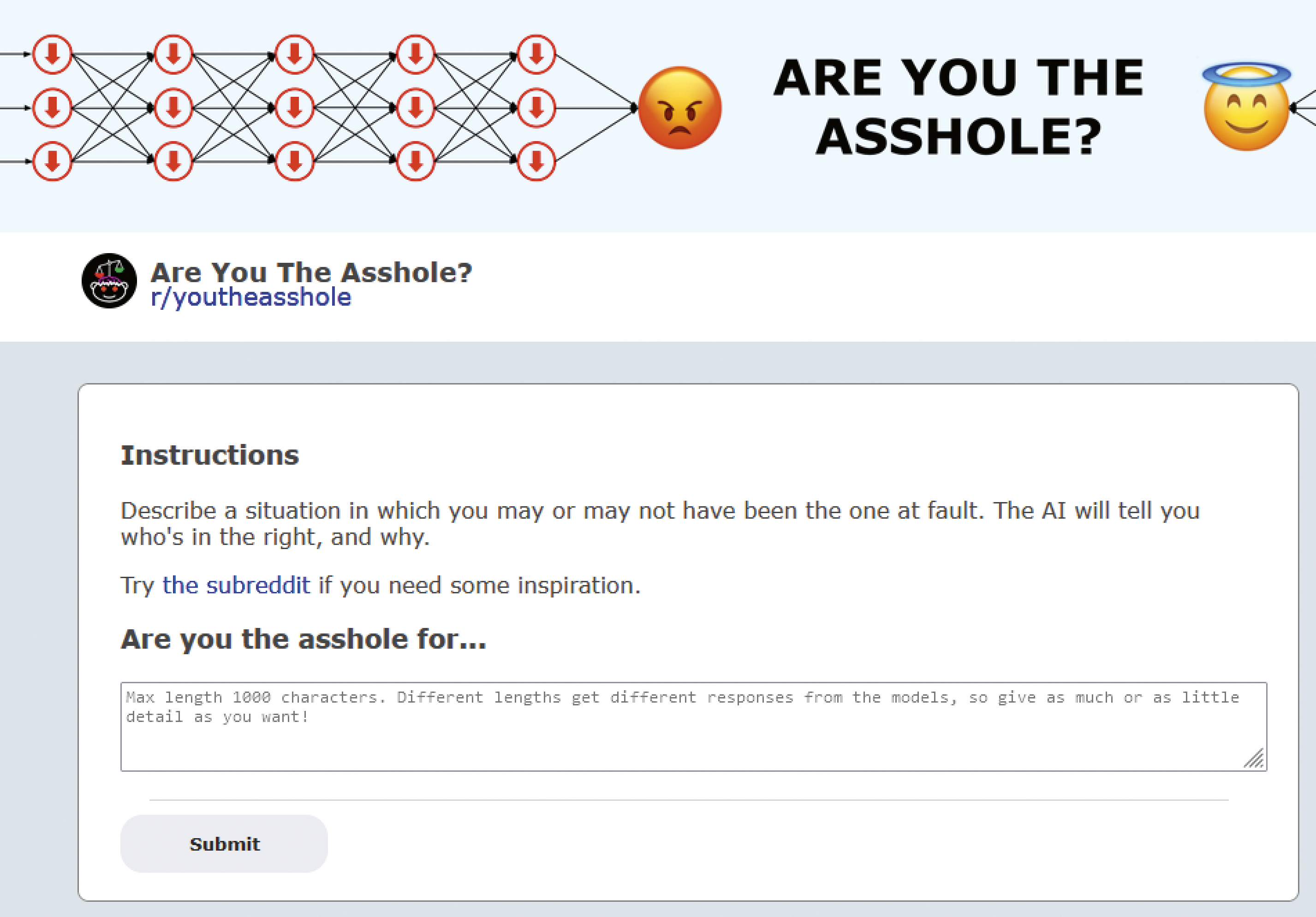 Die Idee des Subreddits ist also, dass Nutzer Personen außerhalb ihres Bekanntenkreises befragen, ob sie sich nach deren Meinung in bestimmten Situationen wie ein Arschloch verhalten haben oder eben nicht. Die Antworten können gewichtet werden, und es gibt eine Art Abstimmungssystem. So wird eine Antwort auf die gestellte Frage generiert.