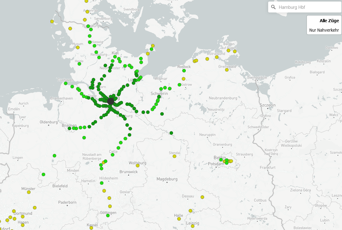 So bringt etwa der EC 7 Reisende zwar direkt vom Hamburger Hauptbahnhof nach Interlaken ins Berner Oberland. Das dauert aber stolze zwölf Stunden – und erzeugt einen tiefroten Punkt. Die Verbindungsdauer erscheint beim Mouse-over über den Zielort. Sehr praktisch: Ein Klick darauf öffnet entweder bahn.de mit der Verbindung oder zeigt die günstigsten Preise an, die die Bahn für die Strecke vorhält. Die Anzeige lässt sich auf Nahverkehrszüge einschränken, was bei der Suche nach möglichen Ausflugszielen mit dem 9-Euro-Ticket sehr hilfreich ist. (hob@ct.de)