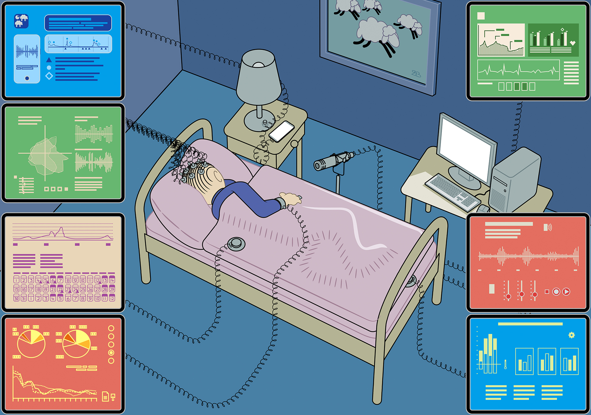Allein die EEG-Messung erfordert ein umfangreiches Verkabeln der Person, deren Schlaf untersucht werden soll – von der Atemmaske ganz zu schweigen. Das macht kaum jemand freiwillig mit, der nur vage das Gefühl hat, morgens unausgeschlafener zu sein als er sein sollte. Durch den Vergleich der Hirnstrombilder lassen sich die oben angesprochenen Schlafphasen der American Academy of Sleep Medicine voneinander unterscheiden.