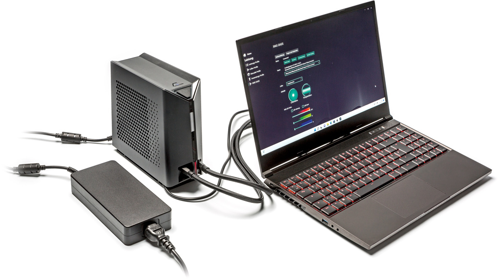 Schenker bietet für das XMG15 eine externe Flüssigkühlung an (Bildmitte). Viel Performance bringt der Extra-Klotz leider nicht.
