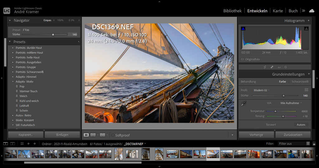 Beim Wechsel von der Bibliothek ins Entwickeln-Modul blieben im Test alle Werkzeuge sowie die Leinwand ausgegraut. Videobearbeitung funktioniert nämlich nur mit einem umständlichen Workaround: zurück ins Bibliotheksmodul, ein Standbild des Videos im JPEG-Format erstellen und dies wiederum im Entwickelnmodul aufrufen. Nun stehen alle Paletten zur Verfügung, die Regler anbieten: also Grundeinstellungen, Gradationskurve, HSL/Farbe, Color-Grading, Details, Objektivkorrekturen und Effekte. Wenn das Standbild fertig bearbeitet ist, kopiert man die Einstellungen (Strg+Umschalt+C), wechselt zurück in die Bibliothek und fügt sie dort im Video ein (Strg+Umschalt+V). So lassen sich auch Voreinstellungen für Farbeffekte und Schwarz-Weiß auf Videos anwenden.