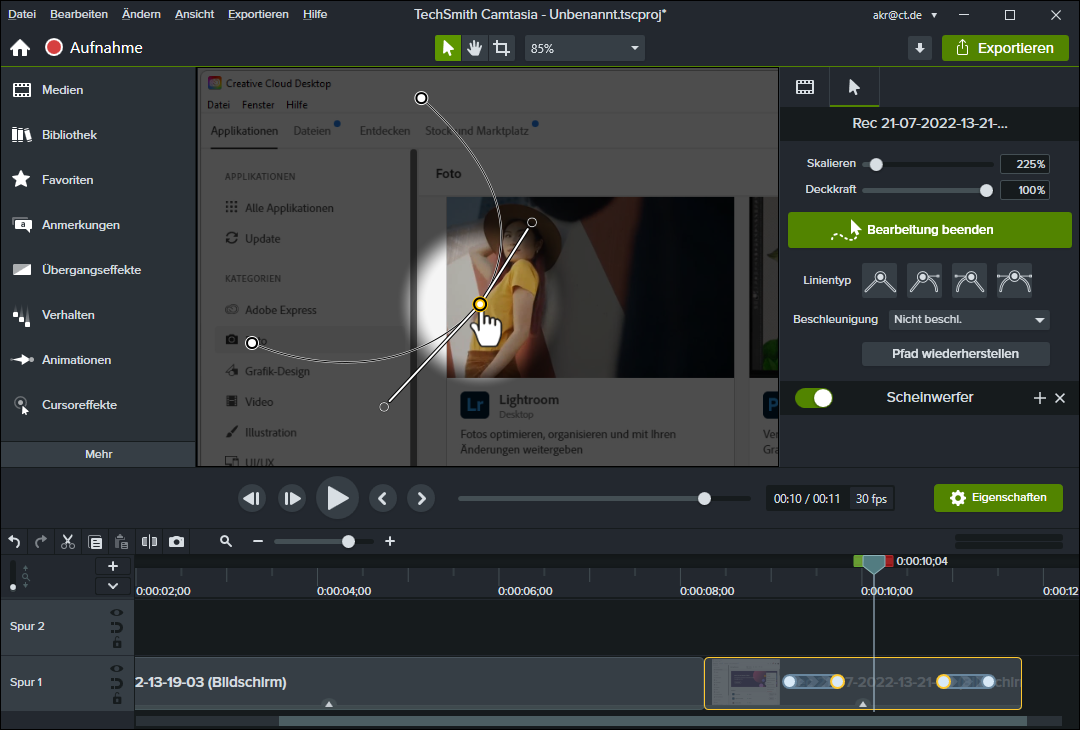 Camtasia 2022 schneidet das Geschehen auf dem Bildschirm und die Webcam mit. Mit Vorlagen, Effekten und neuen Werkzeugen für den Cursor entsteht daraus ein informatives oder unterhaltsames Video. Im Test zeigt sich, ob die neuen Werkzeuge das Upgrade rechtfertigen.