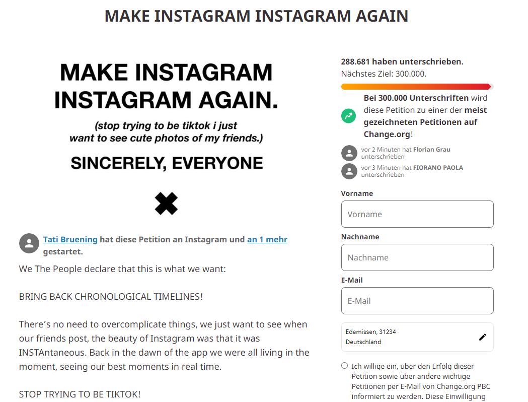 Bei Instagram jedenfalls hat Meta überzogen. Insbesondere Fotokünstler sind gegen die Integration von Videos auf die Barrikaden gegangen. Sie befürchteten, dass ihre Werke in einem Video-Newsfeed nicht mehr die angemessene Beachtung finden würden und starteten die Petition „Make Instagram Instagram again“. Kurz nachdem sich die Top-Influencerin Kylie Jenner der Petition angeschlossen hatte, verkündete der Instagram-Chef Adam Mosseri eine Rücknahme der Neuerungen – vorerst. (jo@ct.de)