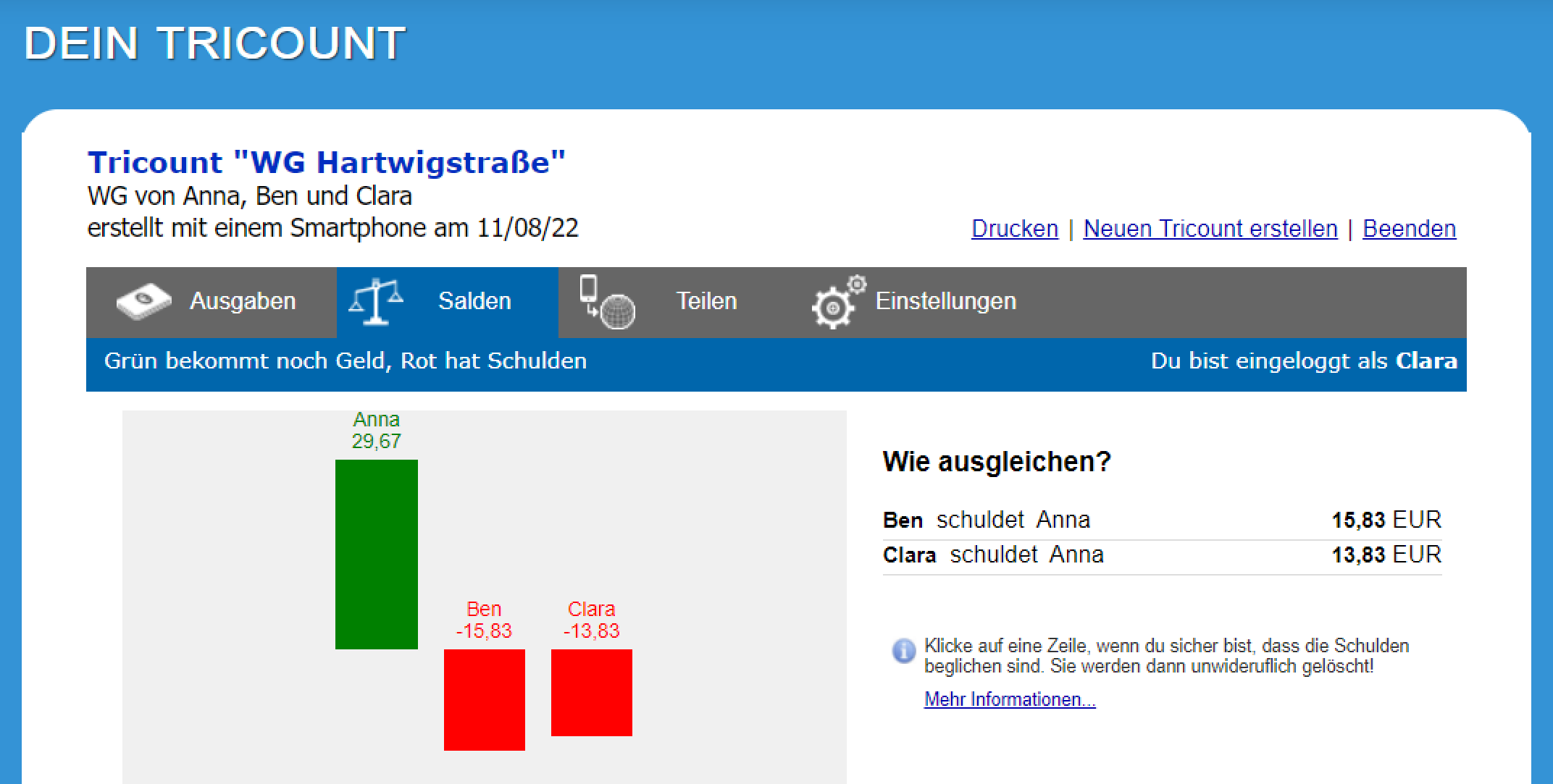 Für Wohngemeinschaften oder Reisegruppen kann der Kassensturz zu einer unübersichtlichen Angelegenheit werden. Im Laufe eines Monats kommen in einer WG etliche Ausgaben zusammen: Der Internetanschluss läuft über Anna, während Ben die Miete zahlt und Clara den Abschlag für Strom und Gas. Alle drei WG-Bewohner kaufen reihum Getränke, Putz- und Lebensmittel ein. Das alles an jedem Monatsende in eine Tabellenkalkulation einzutippen und richtig zu verrechnen, gleicht einer Strafarbeit. Viel schneller, einfacher und zudem fehlerfrei gelingt die Abrechnung mit einer eigens dafür gedachten App.