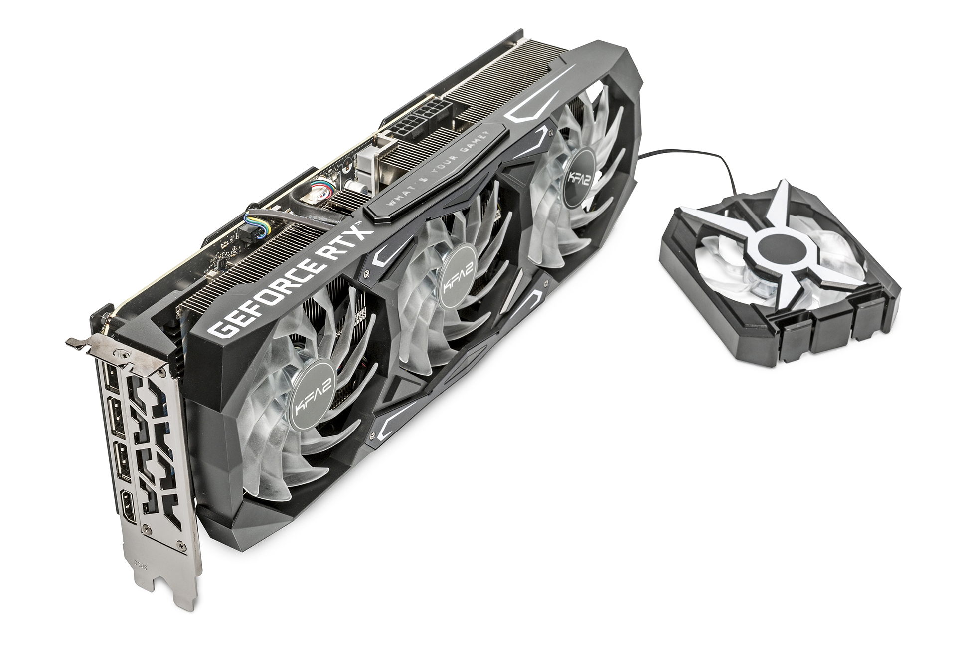 Mit einem aufsteckbaren vierten Lüfter hebt KFA2 seine High-End-Grafikkarte GeForce RTX 3080 Ti SG 1-Click OC aus der Masse hervor. Die schnelle Karte ist aber nicht billig.