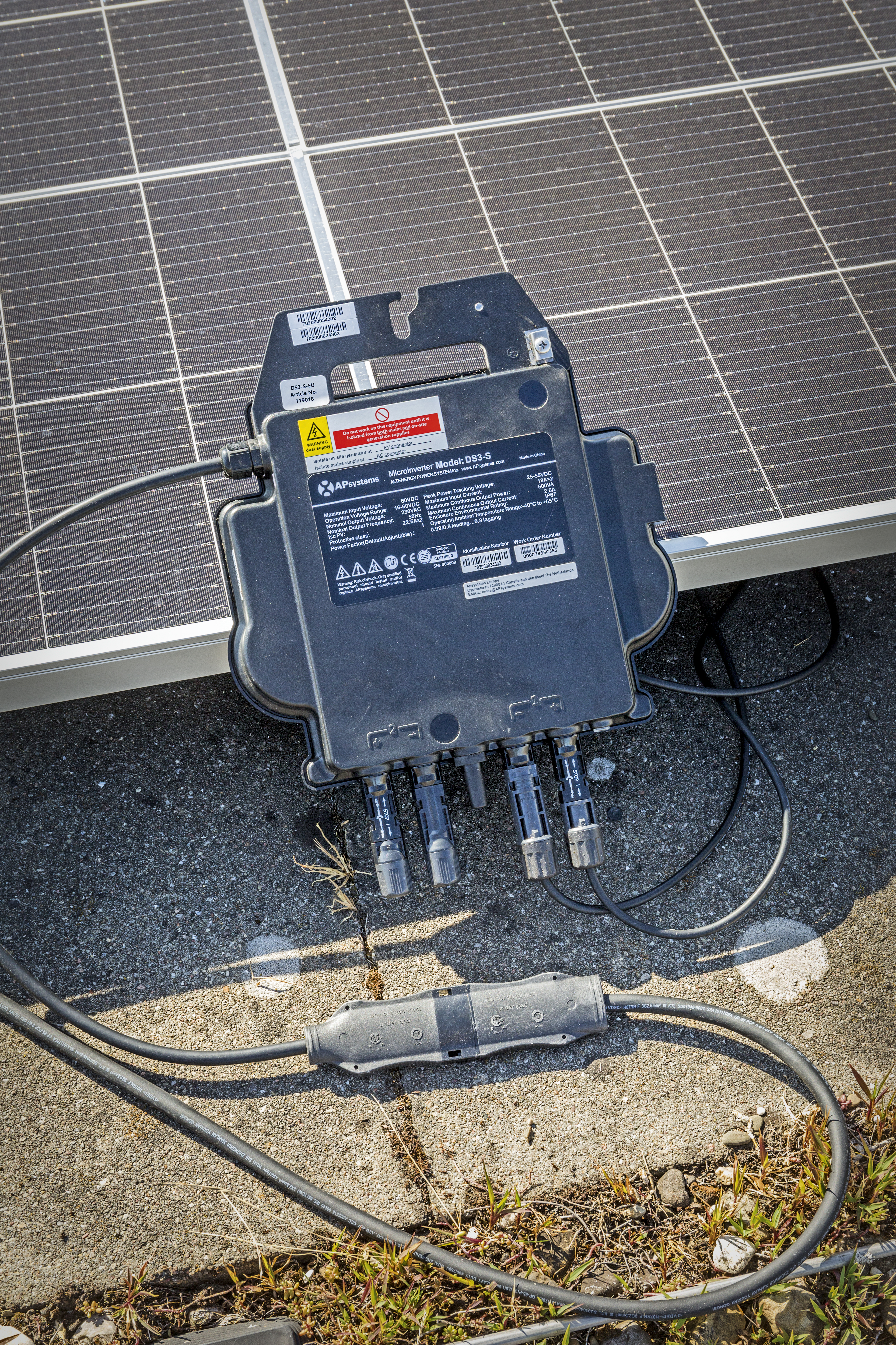 In der Übersicht stach ein Wechselrichter heraus: Der DS3-S von APSystems, der jeweils bis zu 18 Ampere bei 22 bis 55 Volt an seinen zwei Gleichspannungseingängen verträgt; das macht ihn interessant, weil der Trend zu Modulen mit 400 Watt und mehr geht, viele davon aber mit niedrigen Lastspannungen (Vmp) zwischen 29 und 35 Volt arbeiten. Unsere Testmodule etwa – zwei Sunket SKT415M10 und zwei Trina TSM-545DE19 – liefern 13,13 Ampere bei 31,61 Volt beziehungsweise 17,37 Ampere bei 31,4 Volt. Typische Mikrowechselrichter mit 11 bis 13 Ampere können die Leistung solcher Module also nur teilweise abrufen. Die Lastspannung (Vmp) multipliziert mit dem maximalen Eingangsstrom ergibt die verwertbare Leistung in Watt.