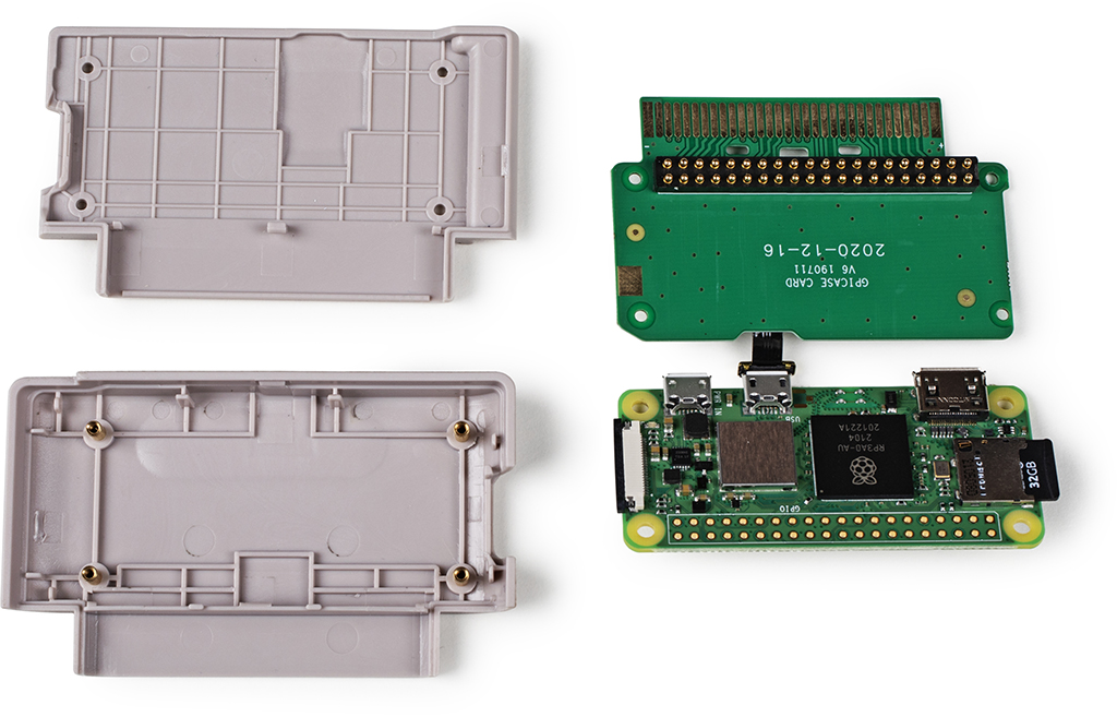 Um den Zero 2 im Spielmodulgehäuse des GPi Case zu platzieren (siehe Foto), müssen Sie das Modul aufschrauben und den Kleinstcomputer mit der darin liegenden Platine verbinden. Dafür richten Sie den Raspi so über der GPIO-Schnittstelle aus, dass Sie problemlos das Micro-USB-Kabel anschließen können. Platzieren Sie den Verbund nun im Gehäuse und schrauben Sie es zu. Die SD-Karte schieben Sie seitlich am Gehäuse ein.
