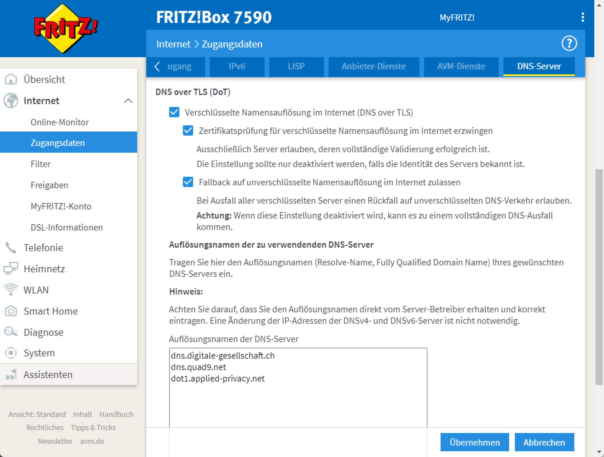 Die Fritzbox baut zu Beginn zu allen eingetragenen DoT-Resolvern Testverbindungen auf, bewertet sie anhand von Geschwindigkeits- und Sicherheitskriterien und lenkt dann die Anfragen zum schnellsten eingetragenen DoT-Resolver. (dz@ct.de)