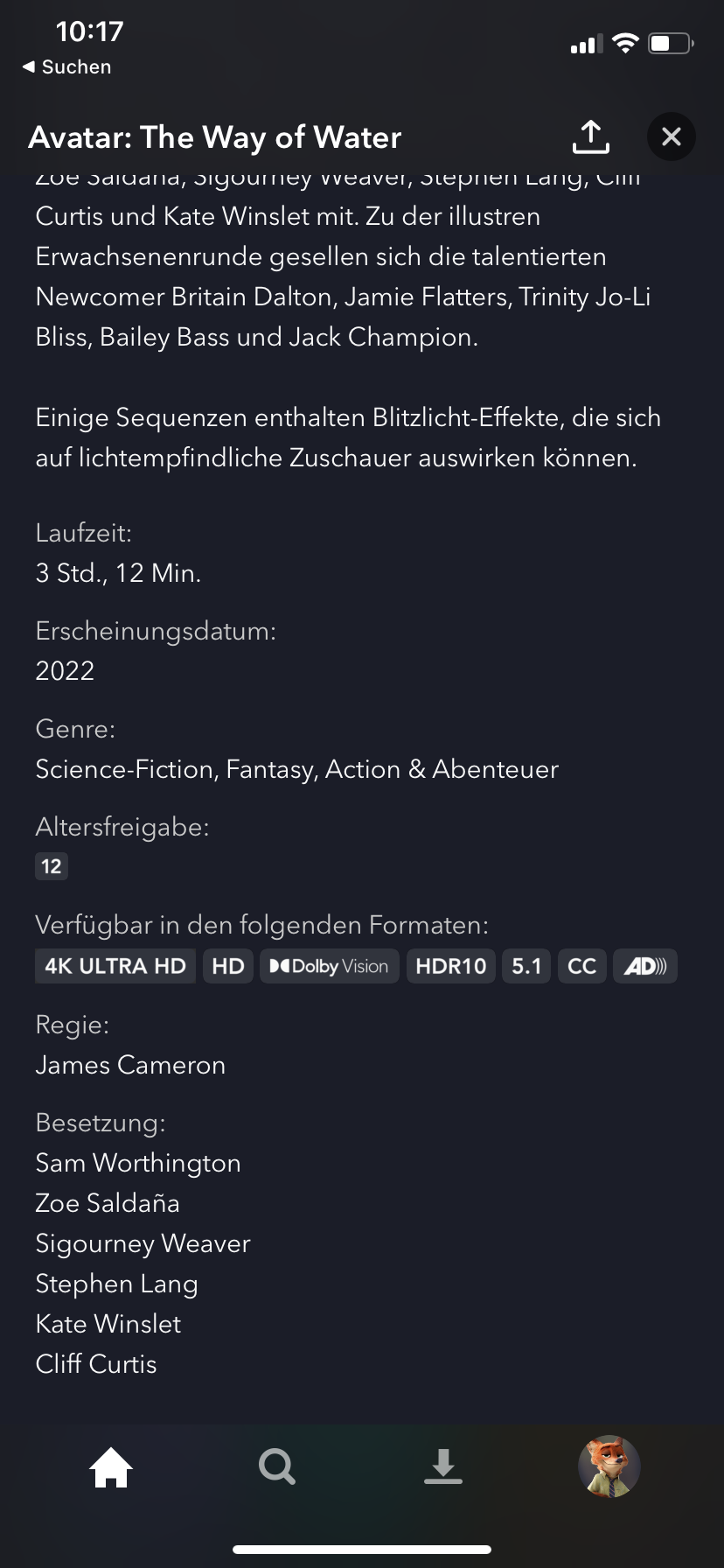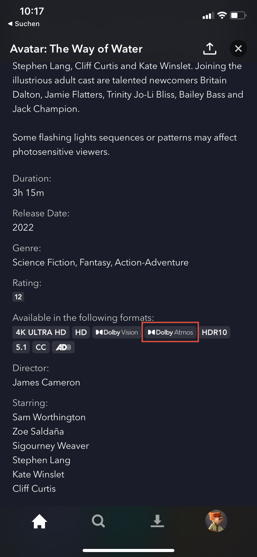 Das ist uns auch aufgefallen und hat uns keine Ruhe gelassen. Unser Autor Timo Wolters hat einen Trick gefunden, wie Sie per Streaming an die englische Originalfassung mit 3D-Ton kommen: Sie müssen dazu in Ihrem Profil die App-Sprache „Englisch (US)“ einstellen. Dann haben Sie nicht nur Zugriff auf Tonfassungen in weiteren Sprachen, sondern auch auf den Originalton in Dolby Atmos. An der deutschen Fassung ändert sich dadurch nichts. Der Zugriff auf den Originalton in maximaler Qualität funktioniert nicht nur bei Avatar, sondern auch bei den Star-Wars-Filmen. (nij@ct.de)