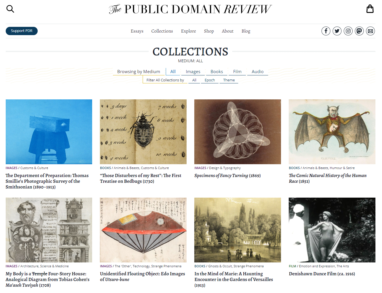 Die im Stil einer altertümlichen Tageszeitung aufgemachte englischsprachige Website Public Domain Review präsentiert eine große Auswahl ausgefallener bis kurioser Werke der Kunst-, Literatur- und Ideengeschichte. Von der ersten Abhandlung über Bettwanzen aus dem Jahr 1730 über Lithografien aus einem „Atlas des Champignons“ (1827) bis zu Filmaufnahmen vom Bau der Twin Towers in New York 1976 gibt es viel zu entdecken und bestaunen.