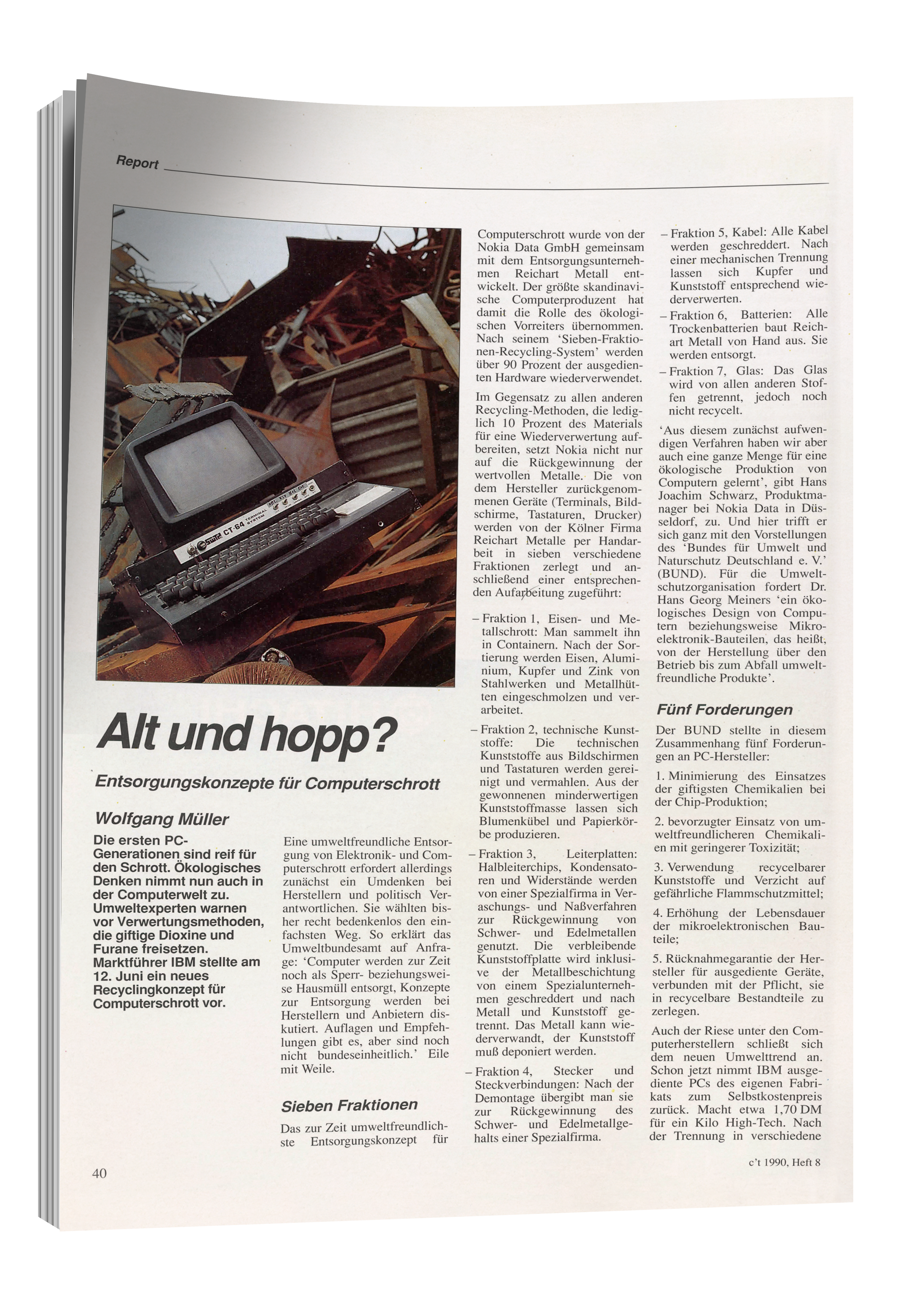Wohin mit dem Altrechner? 1990 landete er meist im Sperrmüll. Über umweltgerechte Entsorgung machte man sich aber schon Gedanken: Wolfgang Müller berichtete in c’t über Recyclingkonzepte für Computerschrott.
