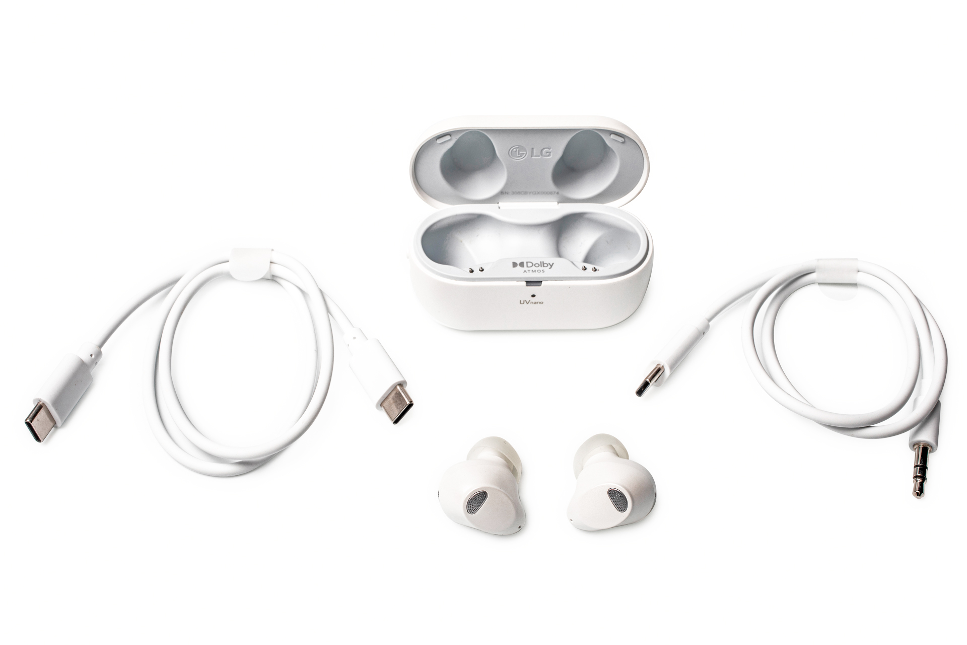 Die T90S stecken in einer handlichen Ladebox, deren Akkukapazität für dreimaliges Laden der In-Ears reicht. Zwei UV-LEDs im Innern sollen die Ohrhörer desinfizieren. Die Ablagerung von Zerumen sollen kleine auswaschbare Schwämmchen in den Silikon-Ohreinsätzen verhindern: Sie nehmen etwaiges Ohrenschmalz auf, bevor es sich am Schallloch des Ohrhörers absetzen kann. LG legt den T90S Silikonaufsätze in vier Größen und einige Ersatzschwämmchen bei.