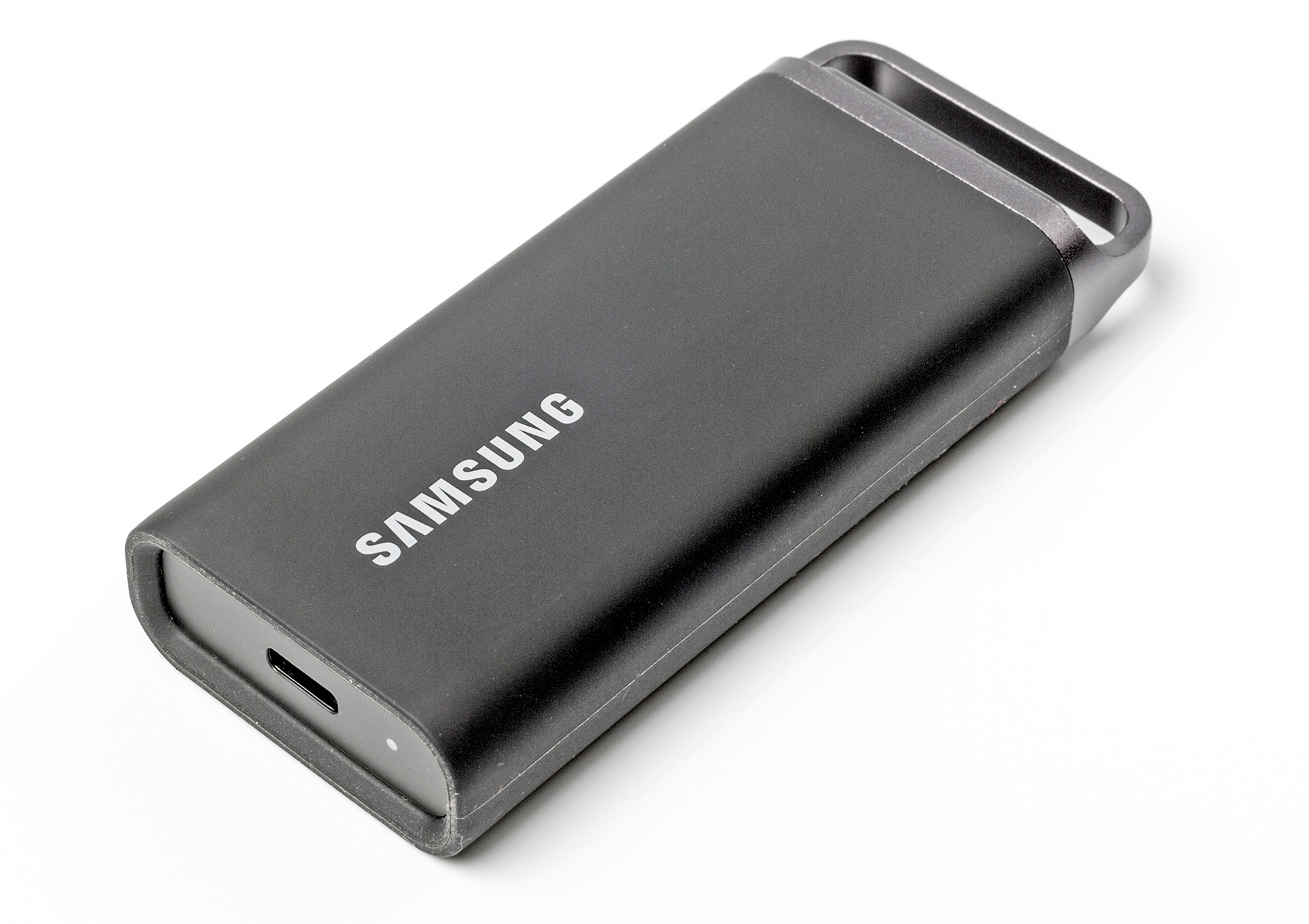 Samsung packt viel Speicher auf kleinen Raum: Die T5 Evo ist kaum breiter als eine Streichholzschachtel und nicht einmal 10 Zentimeter lang. Ihre 102 Gramm Gewicht weisen auf ein stabiles Metallgehäuse hin. Zum Schutz vor Kratzern dient eine Gummihülle, zur Verbindung mit dem PC eine USB-C-Buchse.