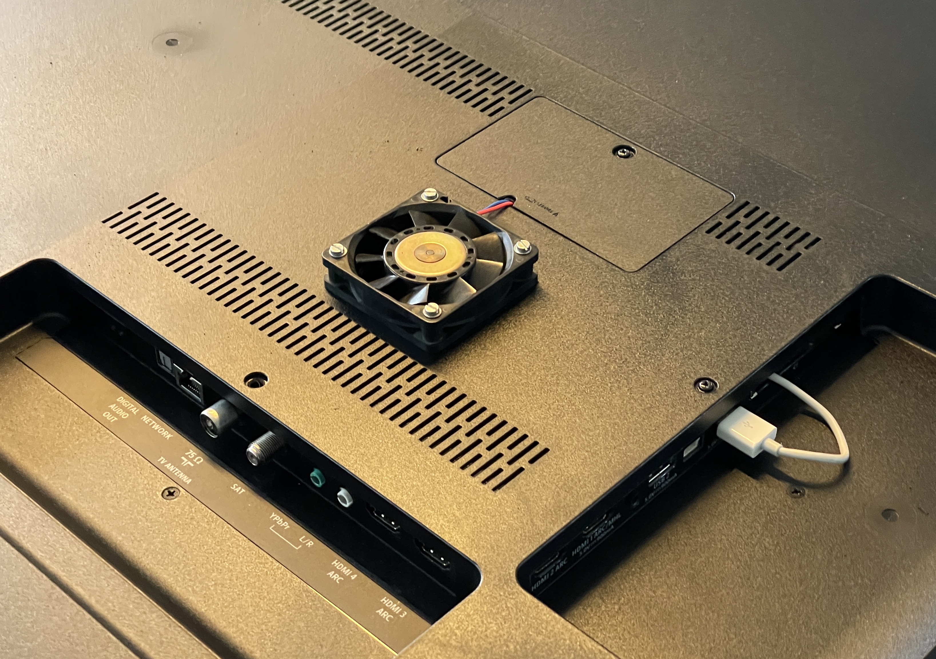 Aus diesem Grunde habe ich unserem Philips-TV einen kleinen Lüfter in der Rückwand auf Höhe des Kühlkörpers spendiert. Die Spannung dazu entnimmt er einer freien USB-Buchse (weißes Kabel). Durch Betrieb mit reduzierter Spannung fällt er akustisch kaum auf, bewirkt aber eine deutliche Temperatursenkung des Kühlkörpers.