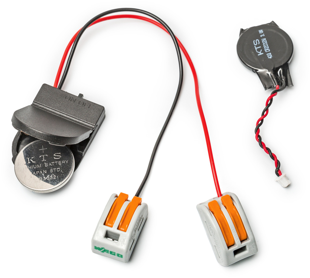 Alternativ schneidet man die beiden Kabeladern der Batterie durch, isoliert sie ab und schließt eine CR2032-Zelle in einem Batteriehalter an – Polung beachten! Die verlötete oder verdrillte Kontaktstelle isoliert man anschließend per Schrumpfschlauch. Oder man verwendet Hebelklemmen für dünne feindrähtige Leiter wie die Wago 222-412.