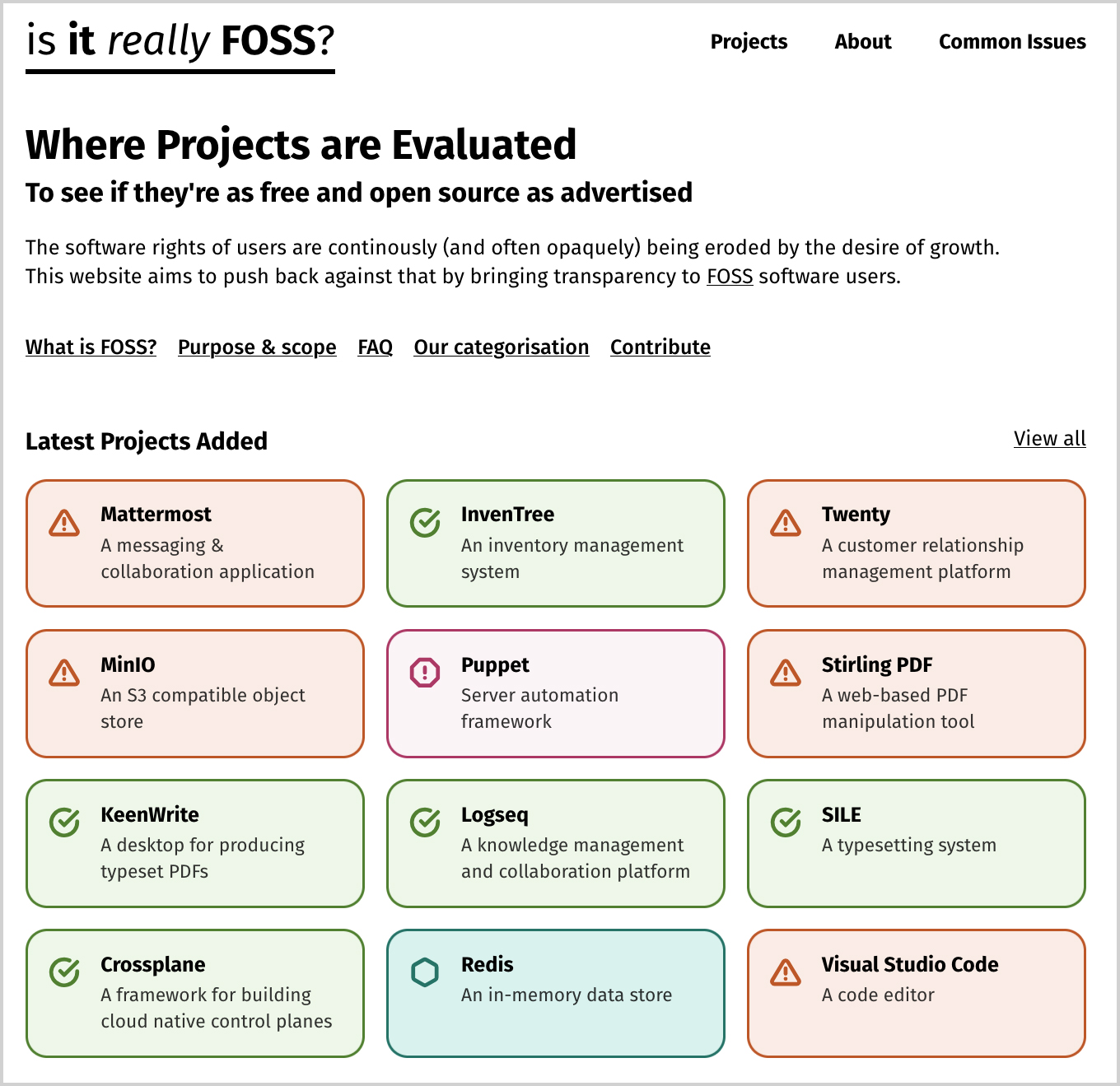 EU-Regularien verpflichten Softwarehersteller und Diensteanbieter zu Transparenz und einer gewissen Offenheit. Vor allem die KI-Szene bedient sich deshalb gerne an positiv besetzten Begriffen wie „open“, „demokratisieren“ oder gleich unverblümt „Open Source“. Einige waren nie im ureigenen Sinne Open Source, wie etwa Metas Sprachmodell Llama, andere verwässern mit der Zeit. Die Website Is it really FOSS? versucht, die komplexe Problematik auf wenige, leicht nachvollziehbare Kriterien zu reduzieren, und sortiert Projekte anhand dieser in fünf Kategorien: FOSS (Free and Open Source Software), Partially FOSS, Largely FOSS with Issues sowie Not FOSS und Not FOSS with Issues. In den beiden Letztgenannten werden Projekte gelistet, die lediglich den Anschein erwecken, Open Source zu sein – entweder weil sie es früher einmal waren oder etwa als solche vermarktet werden („Open Washing“).