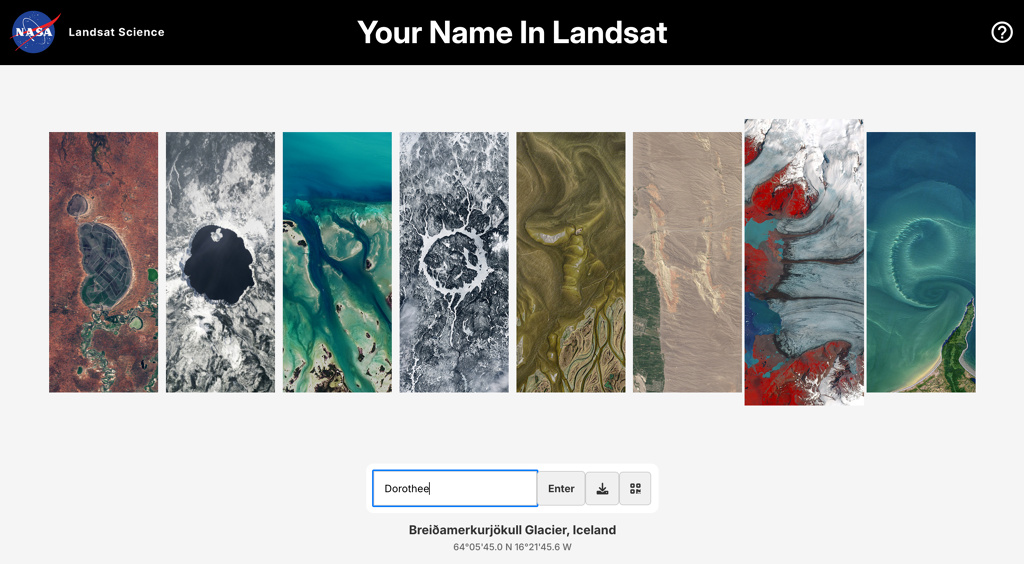 Nur Promis und Tech-Visionäre denken sich für ihre Kinder Namen aus, die sich anhören wie vom anderen Stern. Die diesbezüglich zu kurz Gekommenen können das gewisse extraterrestrische Etwas ihres Namens über das NASA-Projekt YourNameInLandsat erkunden. Einfach den eigenen Vornamen oder irgendeine andere Zeichenfolge eingeben, schon erscheinen die Glyphen in Form von Aufnahmen des Landsat-Satelliten als Flussbiegungen, Seen, Sandbänke oder Gletscherströme. Mein Favorit war im Kurztest eindeutig meine Kollegin Dorothee: Recht unspektakulär beginnend mit Lake Tandou und Crater Lake, malen wilde Flussdeltas die Buchstaben R, O und T. Das H kommt aus Kirgisistan, der Name mündet in ein vom Island-Gletscherstrom geformtes großes E sowie ein kleines geschwungenes aus Sandbänken.