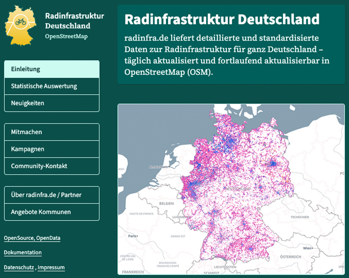 Die Initiatoren des Community-Projekts radinfra.de wollen die Radinfrastruktur Deutschland möglichst lückenlos und inklusive Beschilderung erfassen. Zu der OpenStreetMap-Radkarte können alle beitragen, die inner- und außerhalb ihrer Region unterwegs sind, und zwar auf jedem Level: Einsteiger können mithilfe von Mapillary Fotos hochladen oder sich über die Android-App StreetComplete einbringen. Versiertere nehmen an Kampagnen zur Datenverbesserung teil und bearbeiten im Online-Editor „iD“ von OpenStreetMap die Daten direkt. Sämtliche Daten stehen via OpenStreetMap als Open Data unter ODbL-Lizenz zur Verfügung.