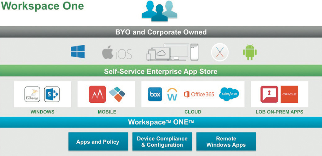 VMware zeigt Workspace ONE Workspace ONE vereint Anwendungsbereitstellung im firmeneigenen App Store für beliebige Endgeräte mit Device Management und Compliance-Überwachung. Quelle: VMware