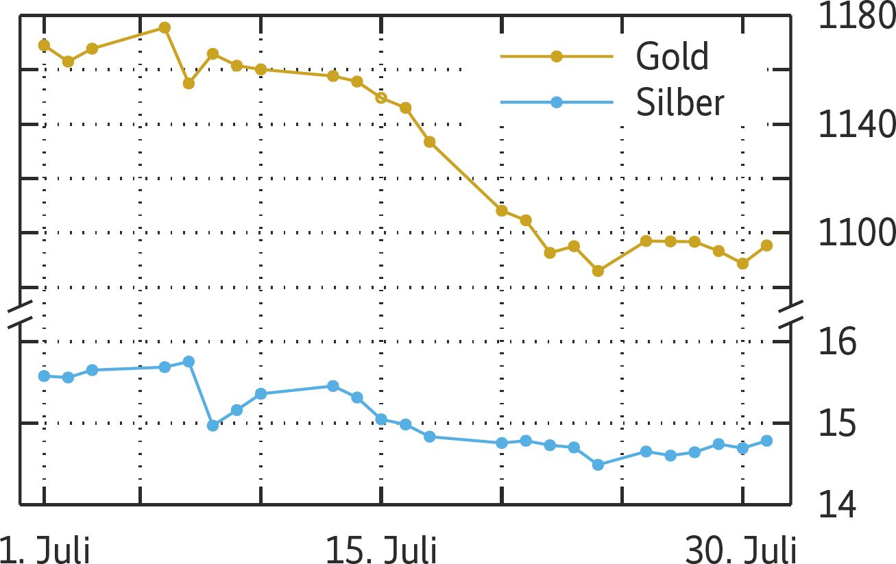 Als Zahlenbeispiel dienen die historischen Kursdaten für Gold und Silber im Juli 2015, die der Website investing.com entnommen sind. Die erste Spalte enthält den Tag gefolgt vom Gold- und Silberpreis: