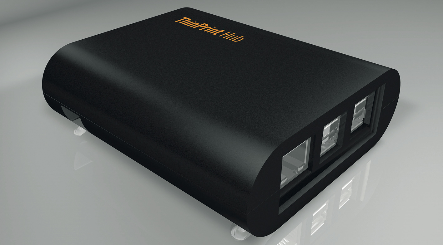 ThinPrint-Druckserver für Außenstellen Der Printserver ThinPrint Hub verbindet Drucker in Außenstellen oder im heimischen Büro mit dem Firmennetz. Quelle: ThinPrint GmbH