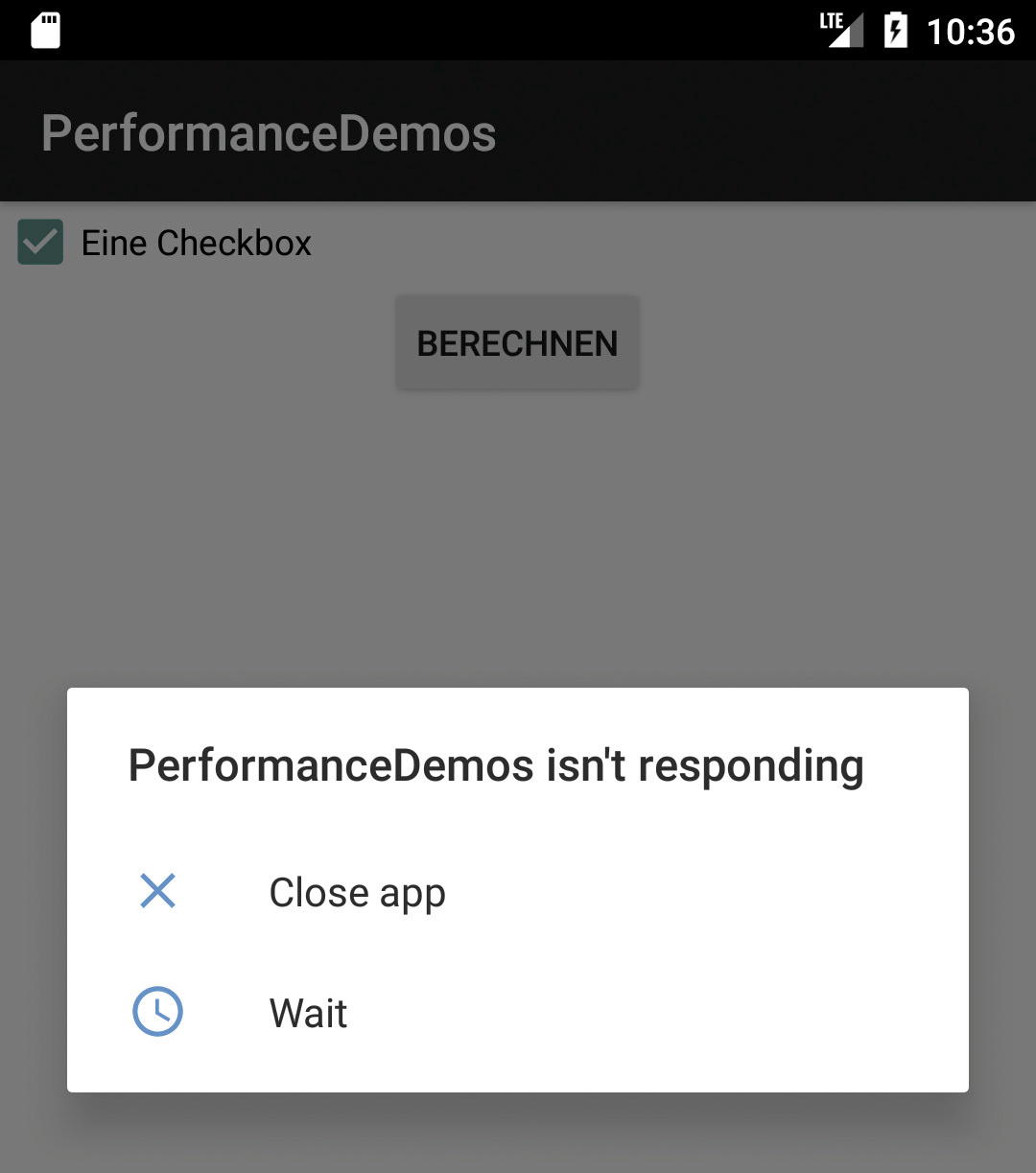 Listing 1 simuliert eine länger laufende Berechnung. Sie zeigt ein häufig auftretendes Ärgernis: Nach dem Anklicken der Schaltfläche „Berechnen“ reagiert die ebenfalls angezeigte Checkbox zunächst nicht mehr auf Eingaben. Erst nach Abschluss der Kalkulation verhält sie sich wieder normal. Die Ursache hierfür liegt darin, dass Android Anwendungscode standardmäßig in einem Thread ausführt, den das System gleichzeitig für alle Aktionen der Oberfläche vorsieht. Blockiert man eben jenen main-Thread, etwa durch Thread.sleep(20000);, funktioniert nichts mehr. Glücklicherweise hängt in diesem Fall nicht das ganze System, sondern bloß die App. Dauert die Blockade zu lange, erscheint die von Anwendern und Entwicklern gleichermaßen gefürchtete Rückfrage (Abbildung 1).