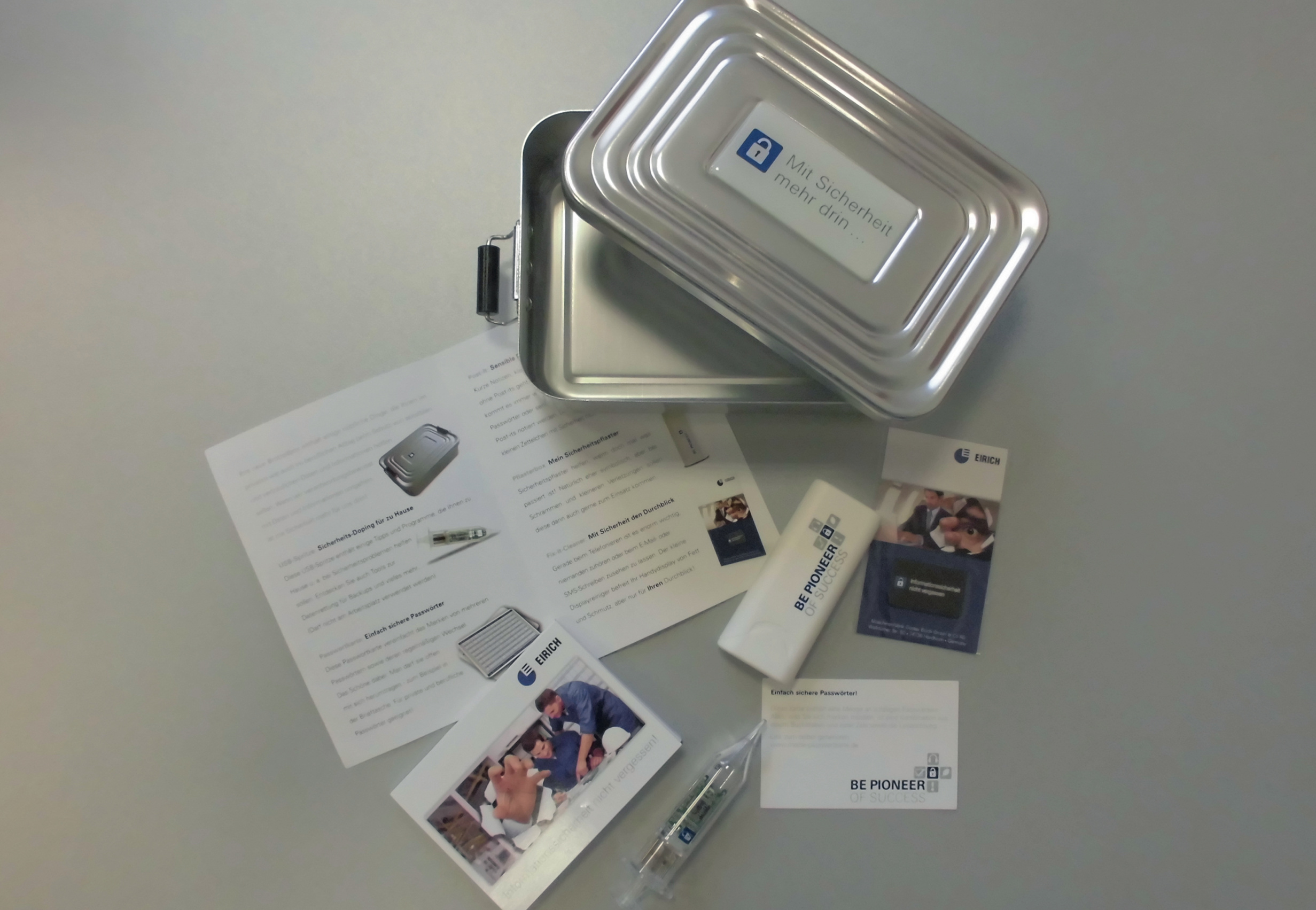 Die Kampagne setzt sich zusammen aus verschiedenen Bausteinen, neben Schulungen und Infomaterial auch Gadgets wie einer Brotdose mit Sicherheitsutensilien, etwa Post-Its mit dem Hinweis „Sensible Daten? Hier sicher nicht“. Bei einem Gewinnspiel war ein iPad zu gewinnen.
