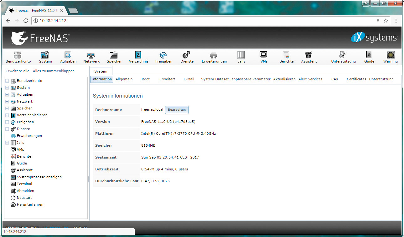 Für das System-Volume verlangt FreeNAS mindestens 8 GByte, außerdem 8 GByte RAM und eine 64-bittige CPU. Mehr ist immer besser, gerade wenn das System mehrere Dienste und Freigaben bereitstellen soll. Allerdings muss die Software nicht unbedingt auf einem dedizierten Server laufen. FreeNAS läuft umstandslos als VM unter VMware oder VirtualBox.