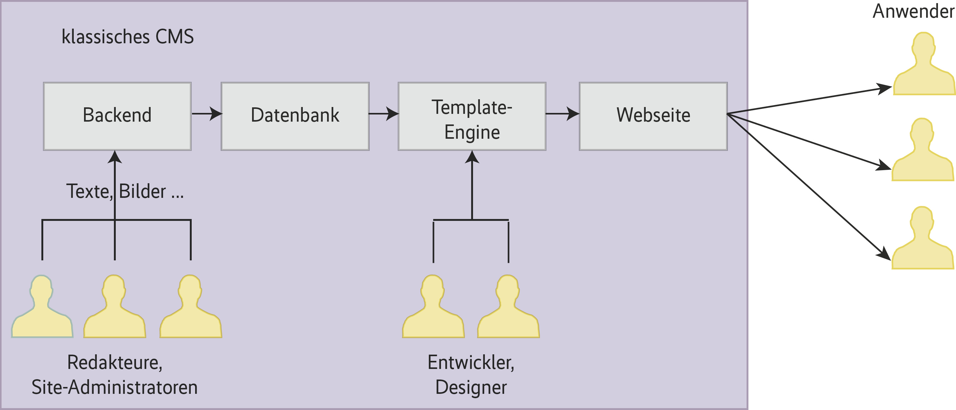 Klassische Content-Management-Systeme besitzen zwei Seiten: Seitenbetreiber und Redakteure pflegen die Inhalte im Backend in eine Datenbank ein. Häufig handelt es sich dabei um passwortgeschützte Unterseiten des Internetauftritts. Besucher sehen das Frontend, das die im CMS enthaltene Template-Engine aus den Inhalten und einer Designvorlage erzeugt. Webseitenbetreiber müssen so nur eine schicke Designvorlage in Form von ein paar CSS- und HTML-Dateien beisteuern, um alles andere kümmert sich das CMS.