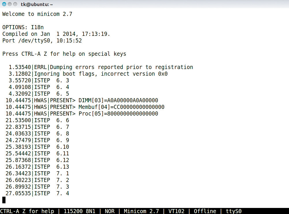 Die OpenPOWER-Firmware besteht aus mehreren Komponenten, die nacheinander zur Initialisierung des Servers ausgeführt werden. Die 21 Schritte heißen ISTEPs (Initialization Steps) und sind durchnummeriert. Beim Serverstart erscheinen auf der seriellen Konsole detaillierte Informationen zu den derzeit durchgeführten Schritten (Abbildung 1). Das erleichtert bei Bootproblemen die Analyse erheblich – so lassen sich auf diese Art etwa falsche RAM-Belegungen erkennen. Zu Beginn (ISTEPS 1 bis 4) initialisiert die Self Boot Engine die CPU und startet anschließend die nächste Komponente (Hostboot). Diese initialisiert in den ISTEPS 5 bis 21 alle weiteren Komponenten (CPU-Bus, Memory-Subsystem, CPU-Cores).