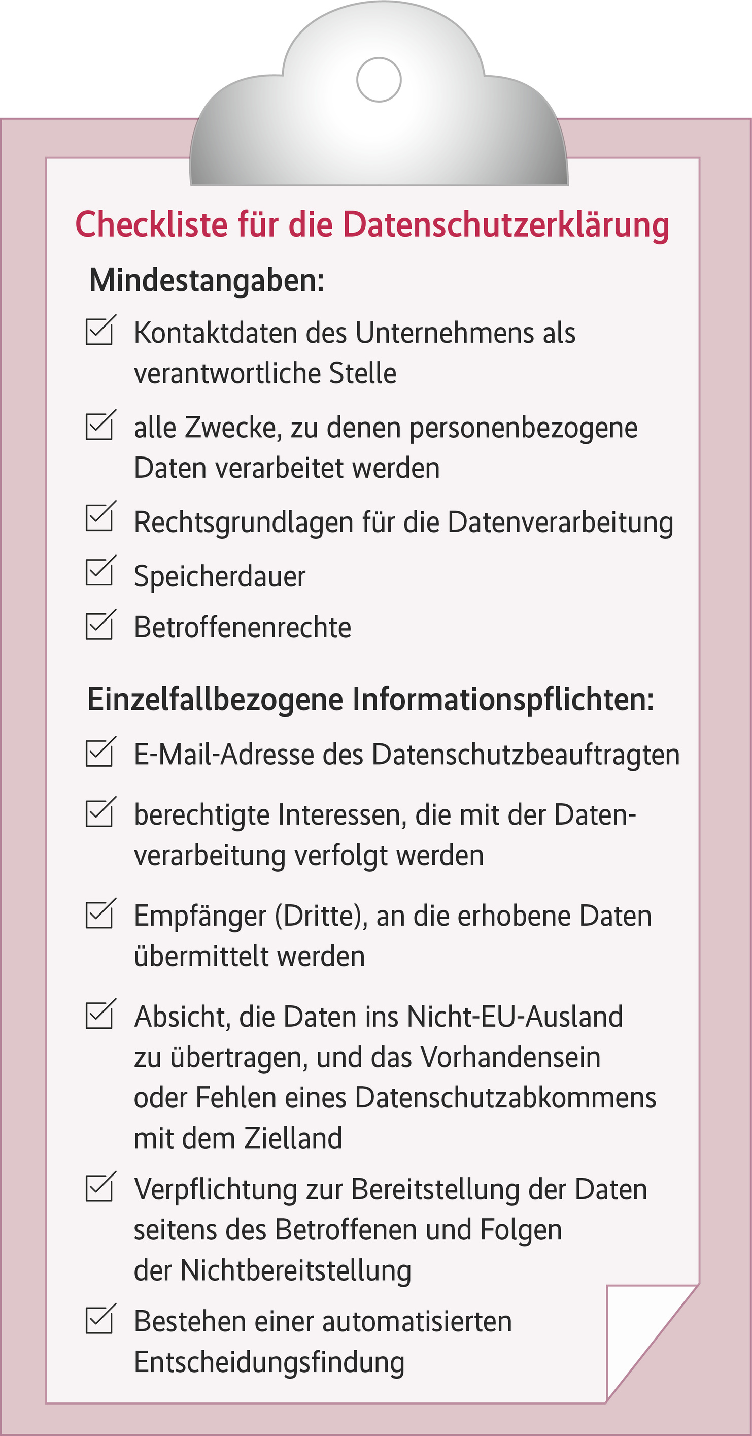 Unternehmen sollten daher genau prüfen, ob und wie sie personenbezogene Daten verarbeiten. Bei der Anpassung der Datenschutzerklärung kann man sich direkt am Gesetzestext orientieren, da Art. 13 der DSGVO die Informationspflichten nunmehr zentral katalogisiert aufführt. Darüber hinaus kann die abgebildete Checkliste dabei helfen, die Datenschutzerklärung zu vervollständigen. Im Zweifelsfall sollte jedoch stets der Rat eines Rechtsanwalts eingeholt werden. (ur)