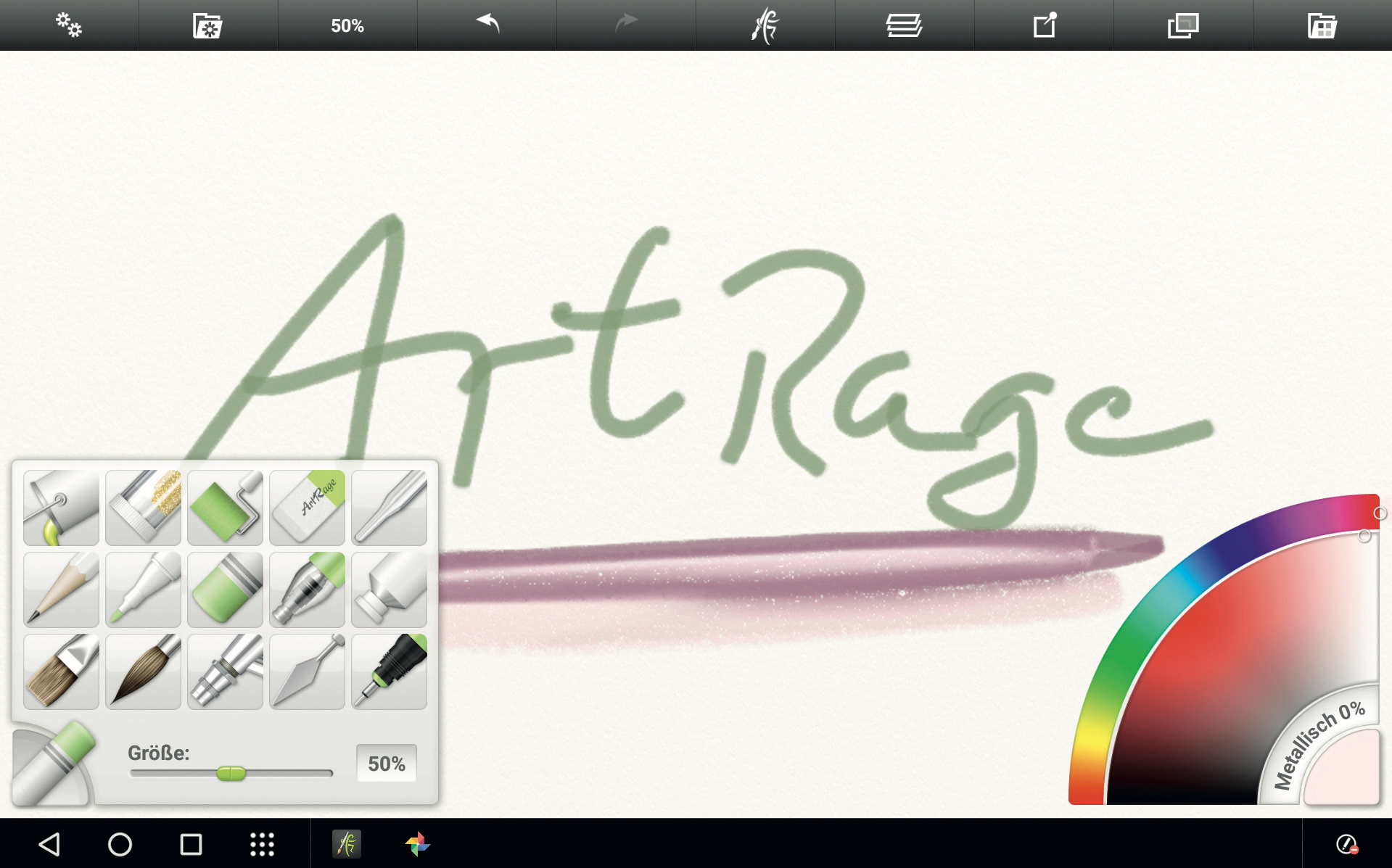 Das Lenovo Yoga Book gibt es mit Android oder Windows 10. Unter Android setzt die App Note Saver die Stiftfunktion um. Sie lässt sich immer über ein Stiftsymbol neben der Tastatur oder durch einen Klick auf ein Icon in der Statuszeile aufrufen. Mit ihr verwaltet man die mit dem Stylus erstellten Notizseiten in Ordnern. Ferner hat Lenovo ArtRage vorinstalliert, ein pixelorientiertes Werkzeug für das Erstellen von Grafiken, das die Druckerkennung des Stiftes voll ausnutzt (siehe Abbildung 2). Hinzu kommen Googles und Microsofts Office-Anwendungen, letztere einschließlich OneNote.