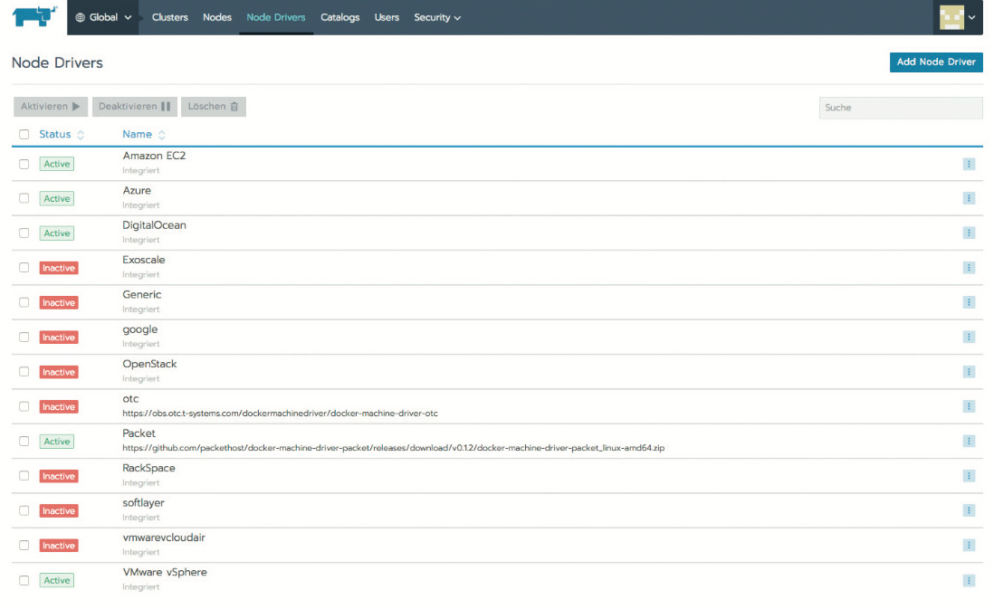 Über Rancher erfolgt das Andocken an bestehende oder der Aufbau neuer Cluster. Nutzer erhalten mehr Freiheit, etwa kostensensitive Strategien zu verfolgen: Ist die Infrastruktur bei einem Provider zu teuer, ist es einfach, einen Cluster bei einem anderen zu verwenden und die Ressourcen dorthin zu verlagern. Dahinter steckt die Funktion, eingebaute Docker Machine Driver zu nutzen. Diese wiederum sind in der Lage, bei jedem registrierten Provider (siehe Abbildung 4) virtuelle Maschinen (VM) als Rancher Agents zu starten. Dafür greifen die integrierten Docker Machine Driver auf die jeweilige API des Cloud-Providers oder der Cloud-Software zu. Dies funktioniert sowohl für Public Clouds von Amazon oder DigitalOcean als auch für Bare Metal, OpenStack oder VMware vSphere.