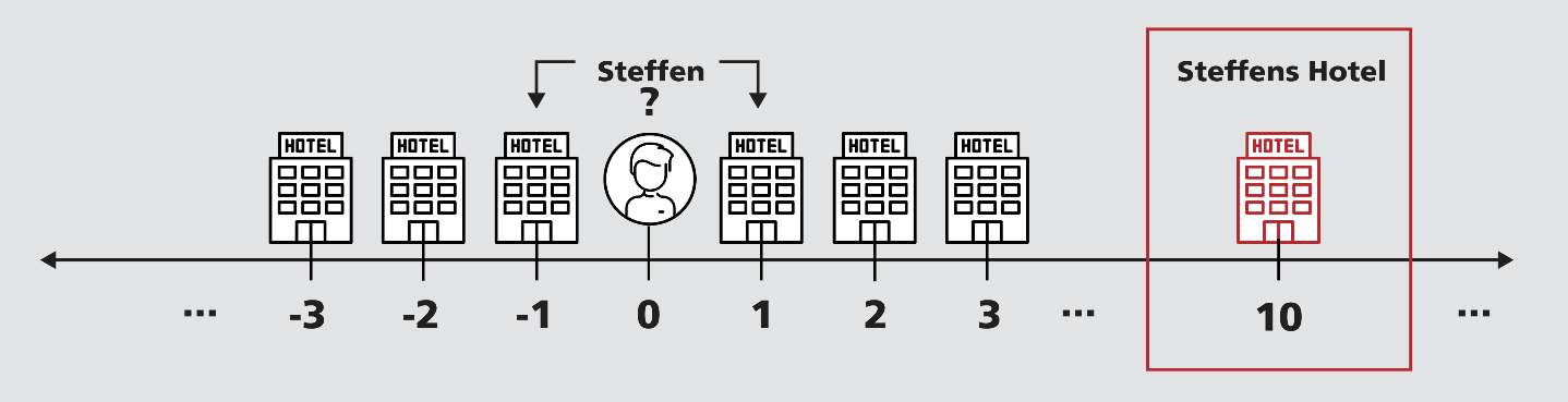 Steffen fasst also den Entschluss, eine Münze zu werfen. Bei Kopf geht er nach links, bei Zahl nach rechts jeweils bis zum nächsten Hotel und schaut, ob es das richtige ist. Falls nicht, wirft er wieder eine Münze und geht entsprechend nach links oder rechts. Wenn der Professor recht hatte, müsste er irgendwann an seinem Hotel ankommen (siehe Abbildung 1).