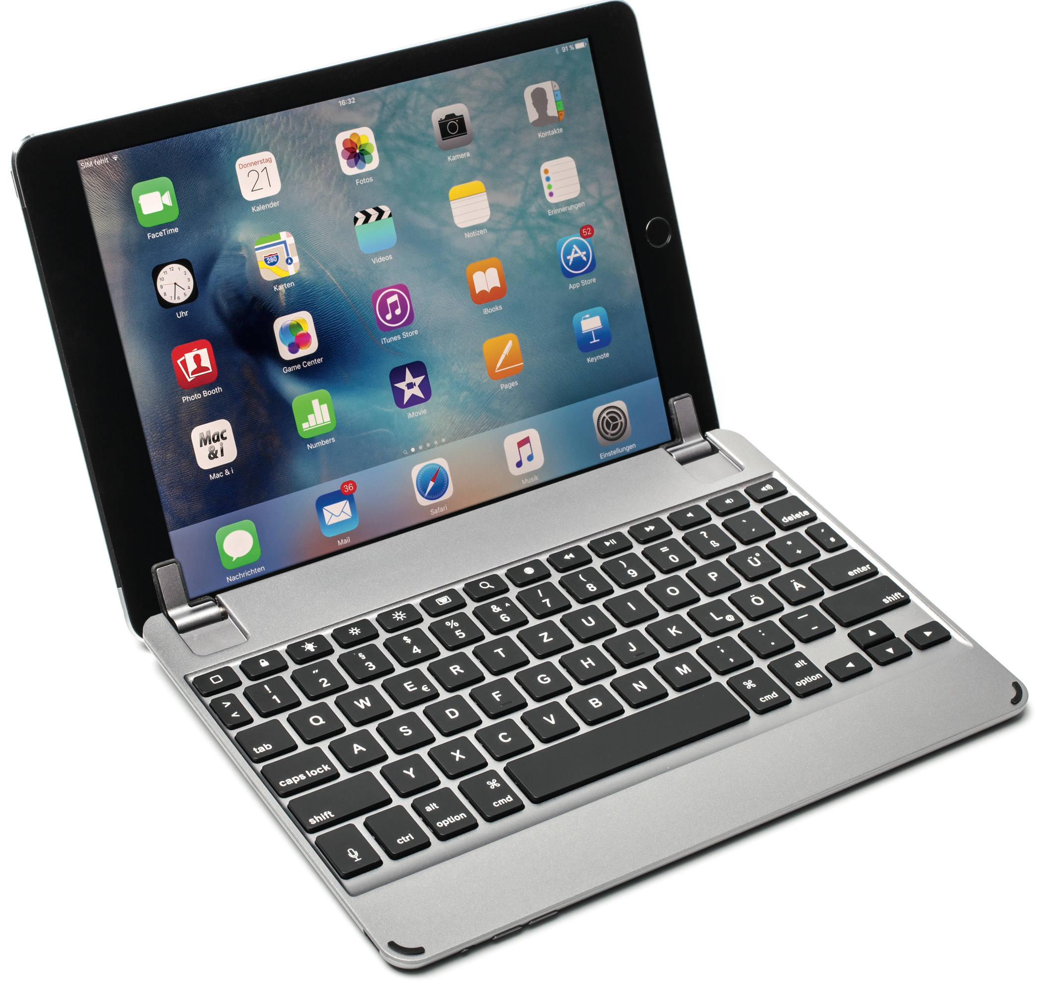 Die in Grau, Silber und Gold erhältliche Aluminiumtastatur ist solide verarbeitet. Auf dem Tisch steht sie ohne zu kippeln, auf dem Schoß wippt sie beim Tippen nur wenig. Zusammen mit dem iPad Air 2 wiegt sie beinahe ein Kilo. Das iPad schiebt man in zwei Haltescharniere, die sich mittels beigefügter Silikoneinlagen für ein Air oder Air 2 anpassen lassen. Allerdings bleibt der Rücken des iPads ungeschützt. Der Neigungswinkel reicht bis 180 Grad. Beim Öffnen heben die Scharniere die Tastatur hinten ein wenig an.