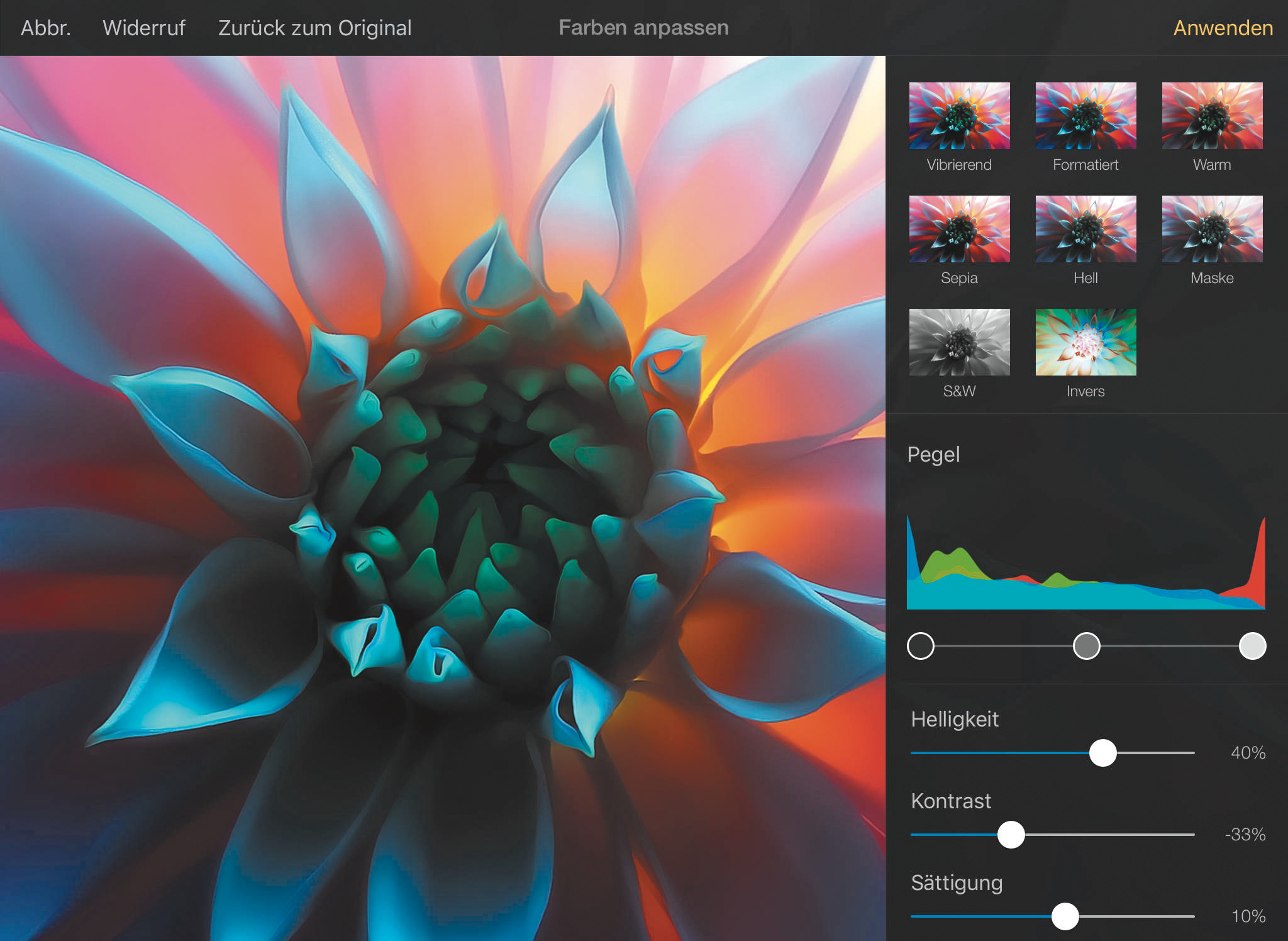 Bei der Farbkorrektur hat der mobile Pixelmator der Mac-Version einen Weißabgleich voraus. Am Tablet ist die App übersichtlicher und einfacher zu bedienen. Korrekturen und Filtereffekte wie Weich- oder Scharfzeichner sind destruktiv, verändern also im Unterschied zum Skalieren direkt die Pixel einer Ebene und lassen sich nicht nachträglich justieren.
