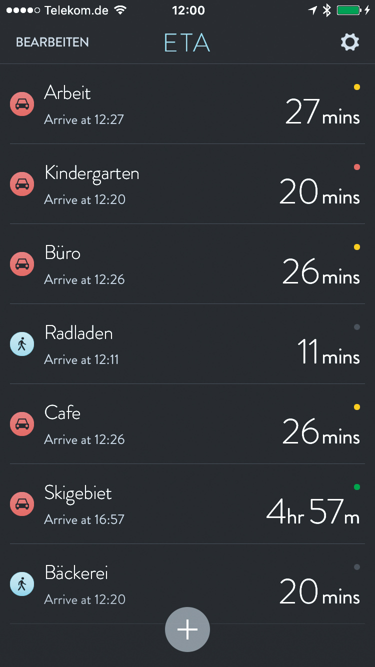 Die aktuelle Verkehrslage, die der Kartendienst inzwischen zuverlässig bereitstellt, wird berücksichtigt. Ampelfarben signalisieren die Verkehrsverhältnisse: Bei Grün gibt es keine besonderen Vorkommnisse, bei Gelb ist mit erhöhtem Verkehrsaufkommen zu rechnen, bei Rot liegt eine größere Störung vor. ETA kalkuliert die zusätzlich benötigte Zeit jeweils mit ein und führt diese in der Detailansicht auf. Die App bezieht auch Erfahrungswerte zur Verkehrsdichte im weiteren Verlauf des Tages ein und gibt etwa den Ratschlag, gleich aufzubrechen, um noch möglichst gut durchzukommen.