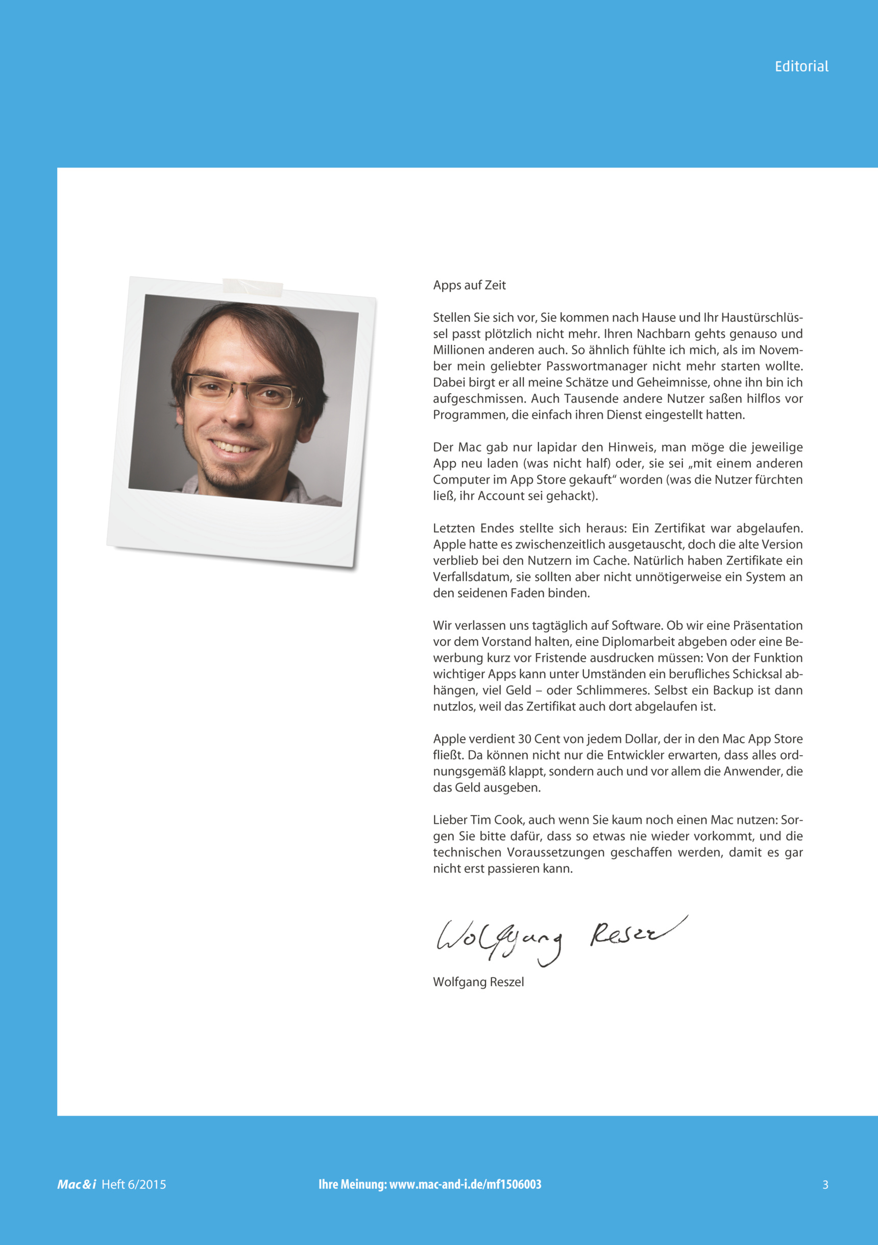 Apps auf Zeit, Editorial von Wolfgang Reszel, Mac & i Heft 6/2015, S. 3